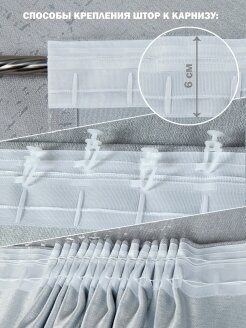 | Комплектация | В комплект входит тюль , которая крепится на карниз при помощи шторной ленты. на широкой прозрачной ленте 6 см ( два уровня петель) |