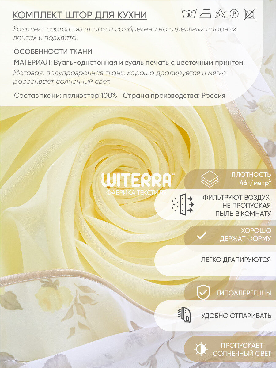 | Комплектация | ламбрекен - 1 шт., портьера-вуаль - 1 шт., подхват - 1 шт |