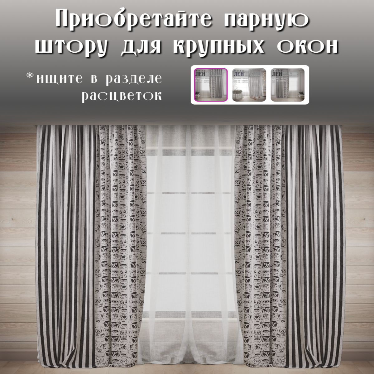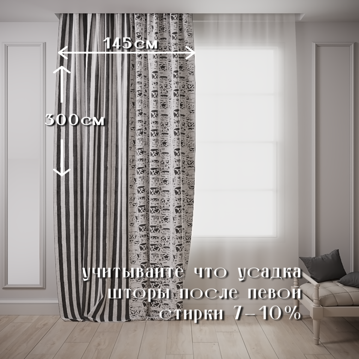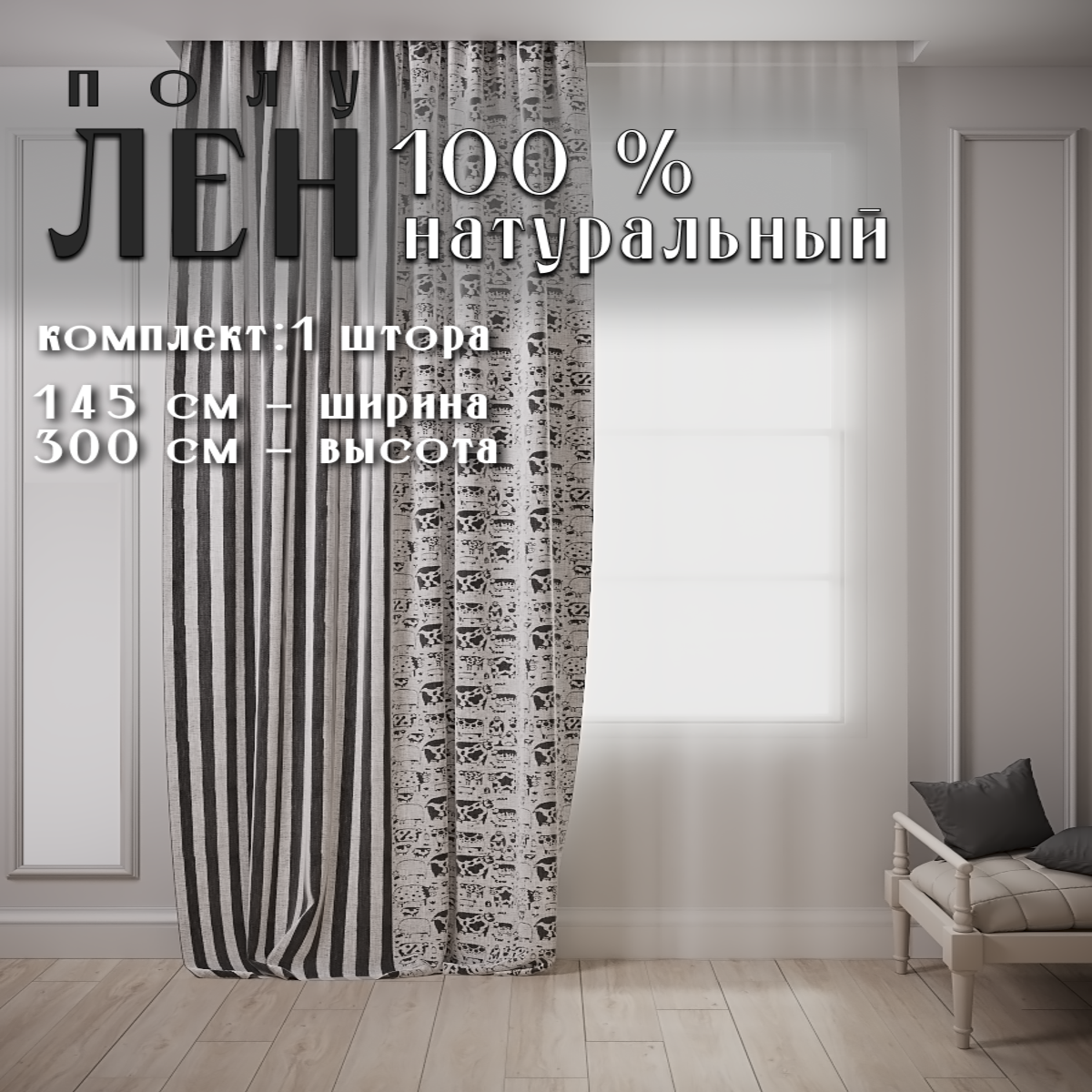 Натуральные льняные шторы 100%, лен хлопок полулен, ширина 145, высота 300, левая, черный / серый интересное: