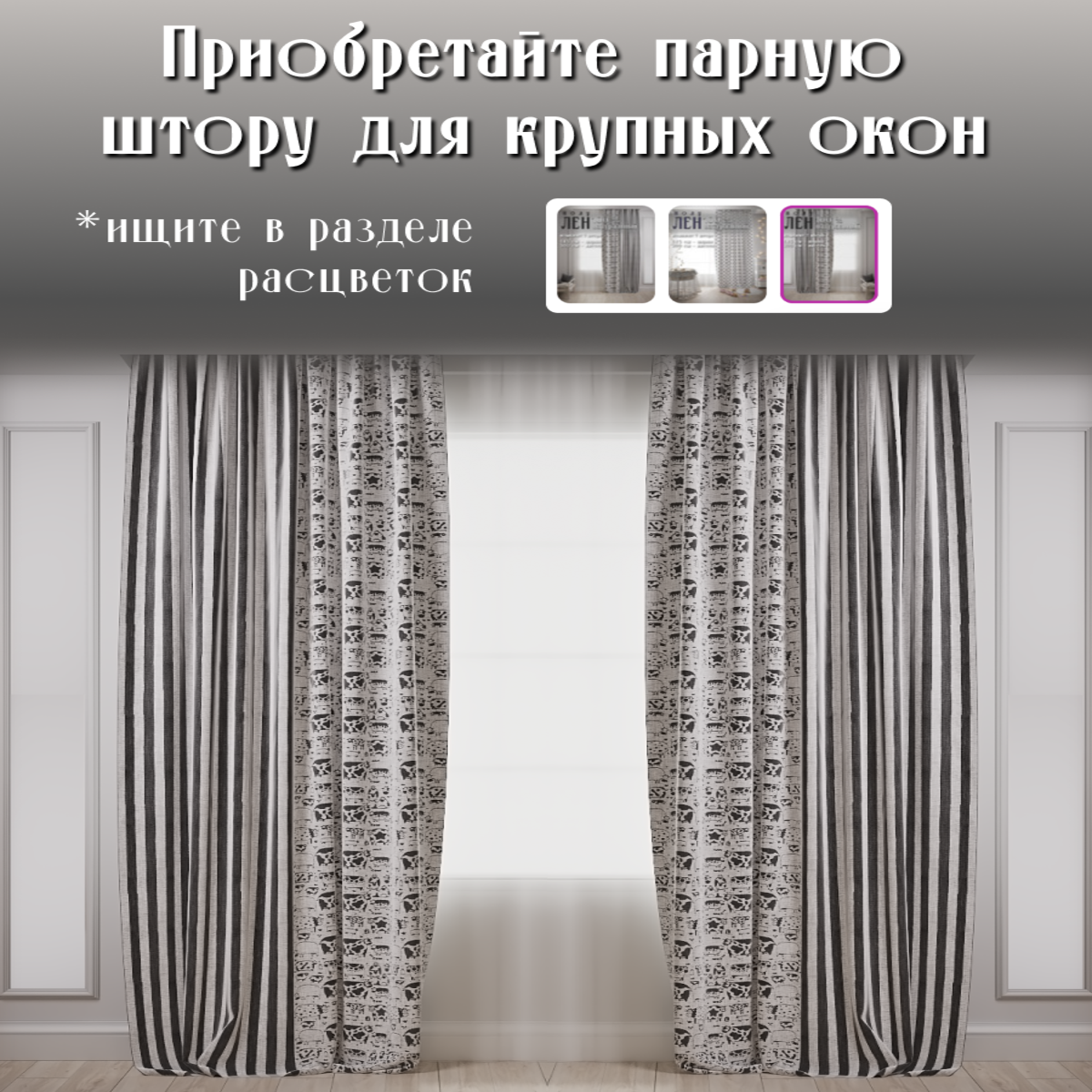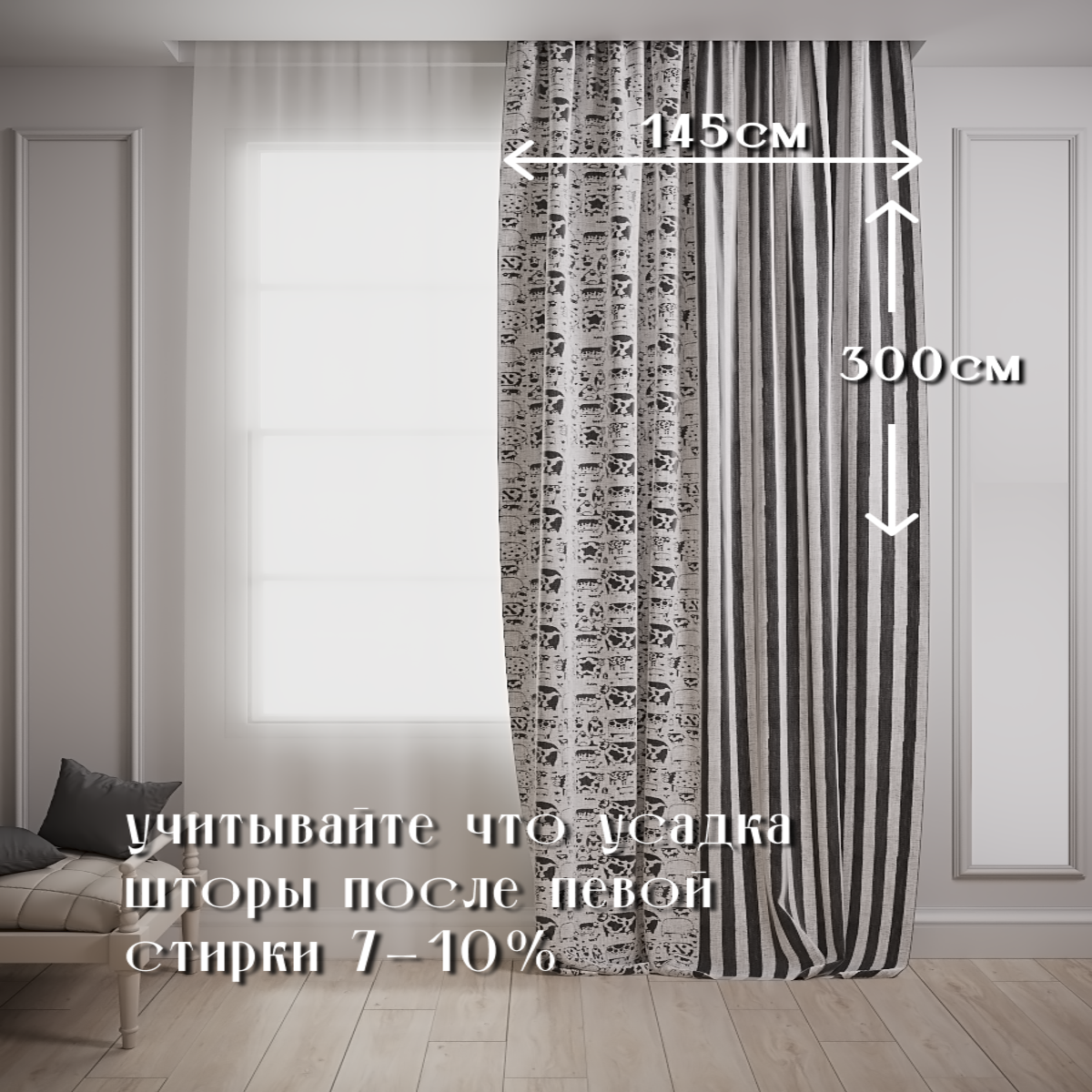 Натуральные льняные шторы 100%, лен хлопок полулен, ширина 145, высота 300, правая, серый / черный интересное: