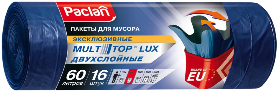 Комплект Paclan MULTI-TOP LUX Мешки для мусора ПВД темно синий 60 л. 16 шт. в рулоне х 2 шт.