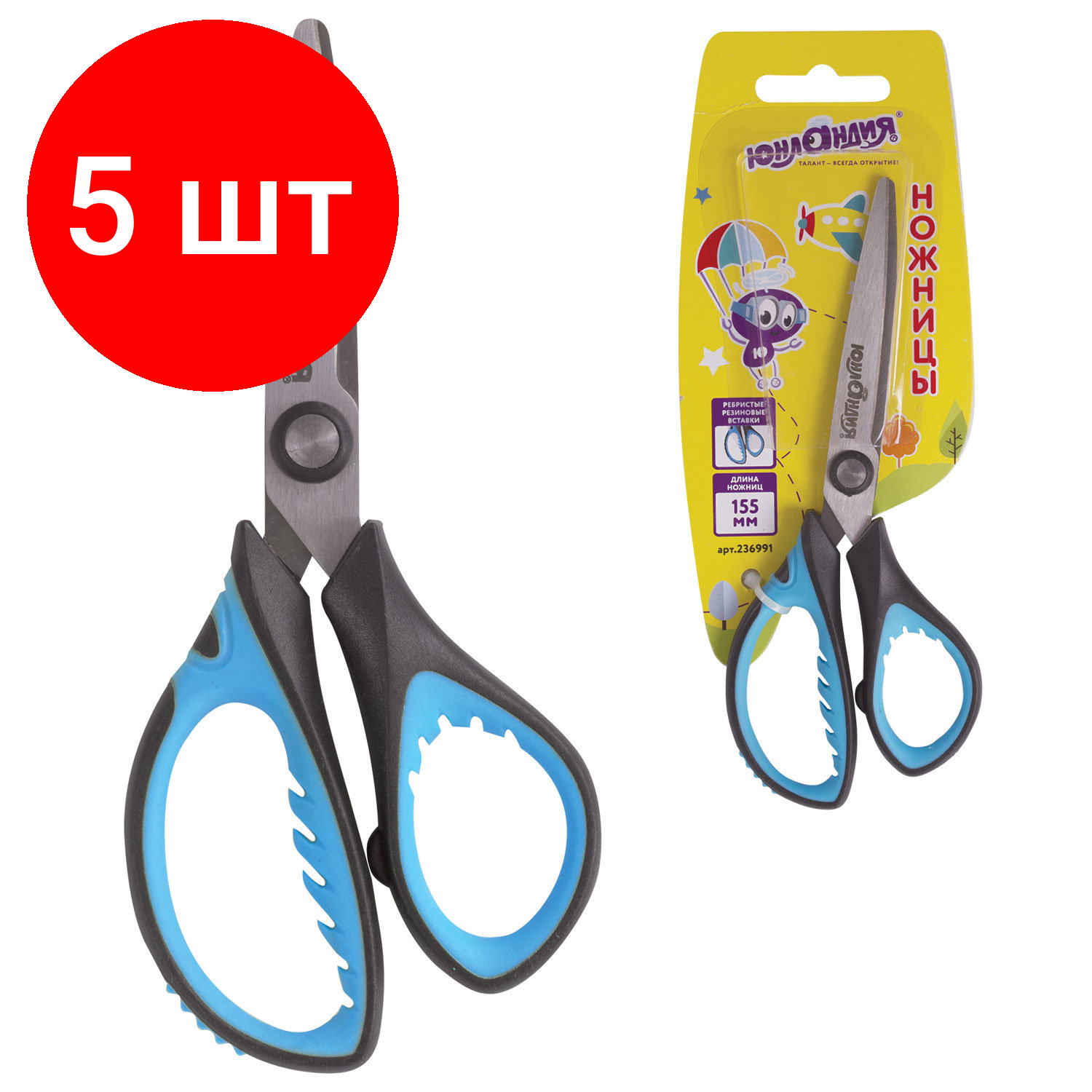 Купить Комплект 5 шт, Ножницы юнландия "BASIC", 155 мм, ребристые резиновые вставки, черно-голубые, европодвес, 236991