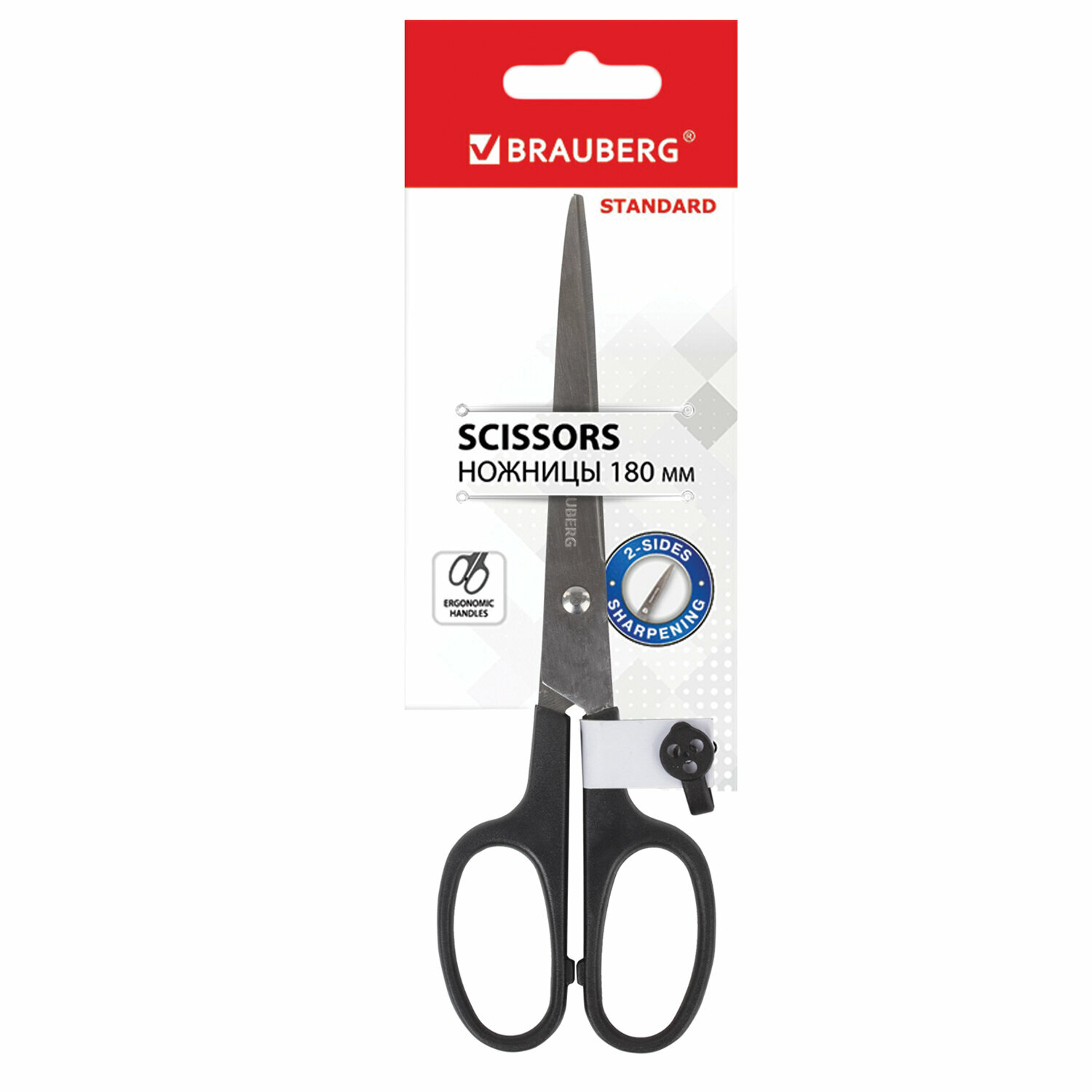 Ножницы Brauberg Standard, 180мм, черные, классической формы, 2-х сторонняя заточка (237096)