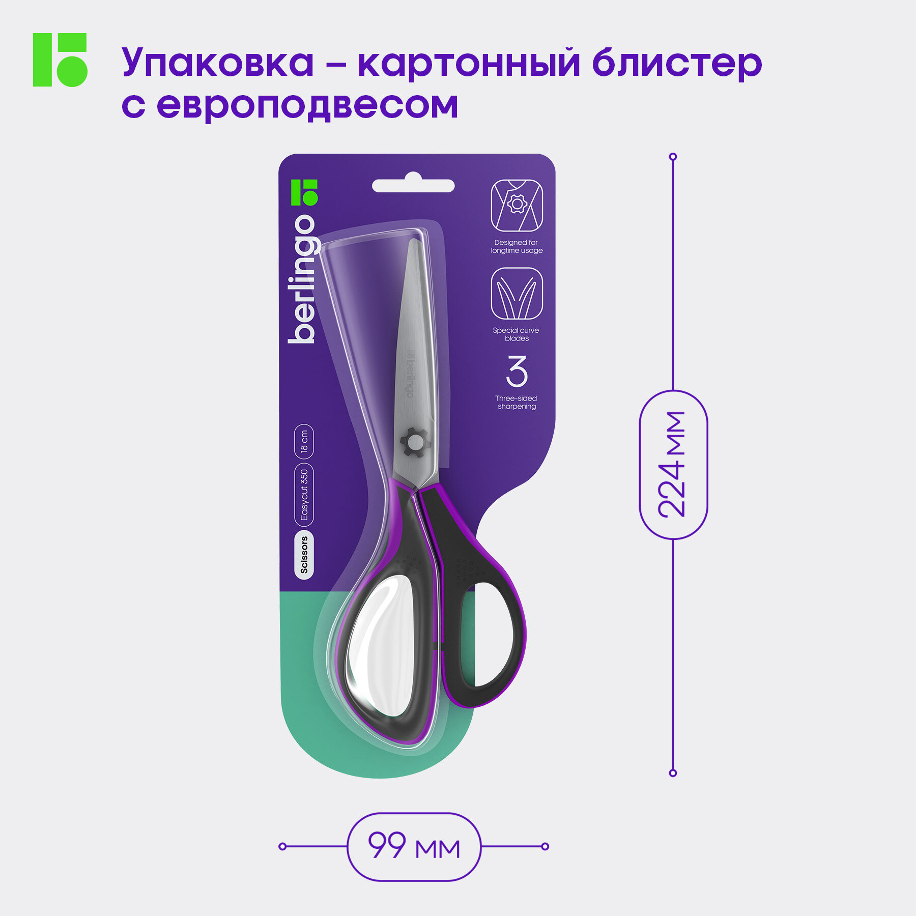 Комплект 3 шт, Ножницы Berlingo "Easycut 350", 23см, сиреневые, эргономичные ручки, мягкие вставки, европодвес