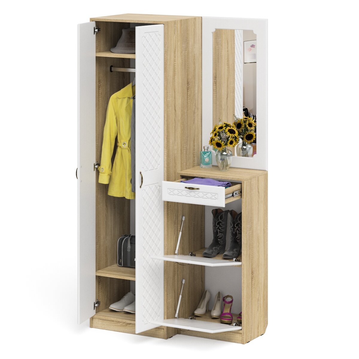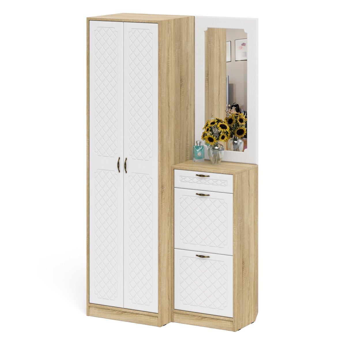 Купить Зеркало для прихожей с обувницей и шкафом П-6, цвет дуб сонома/фасады МДФ белое дерево фрезеровка ромб, ШхГхВ 110х50х210 см.