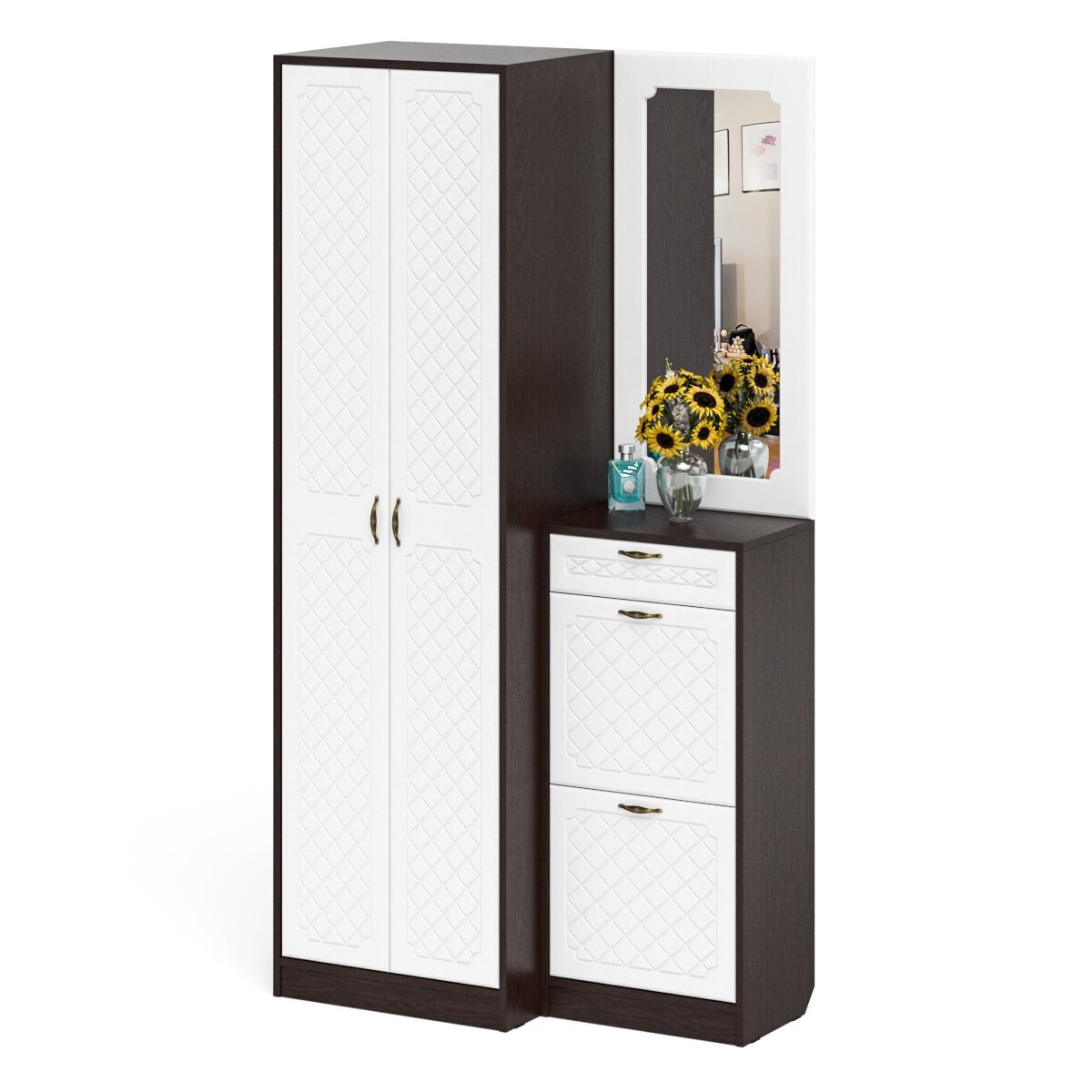 Прихожая П-6 Тумба для обуви 2 секции + Зеркало, цвет венге/фасады МДФ белое дерево фрезеровка ромб
