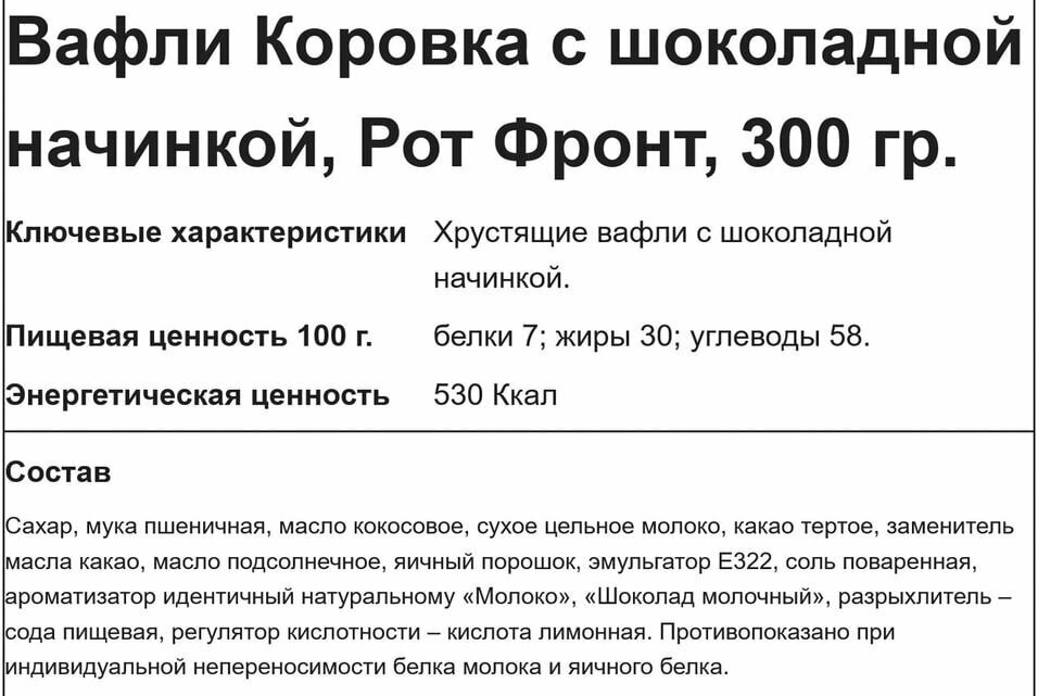 Ниже Вы можете прочитать отзывы на Вафли Коровка с Шоколадной начинкой 300 г, ознакомится с подробными характеристиками, посмотреть интересные обзоры и фотографии на Вафли Коровка с Шоколадной начинкой 300 г.