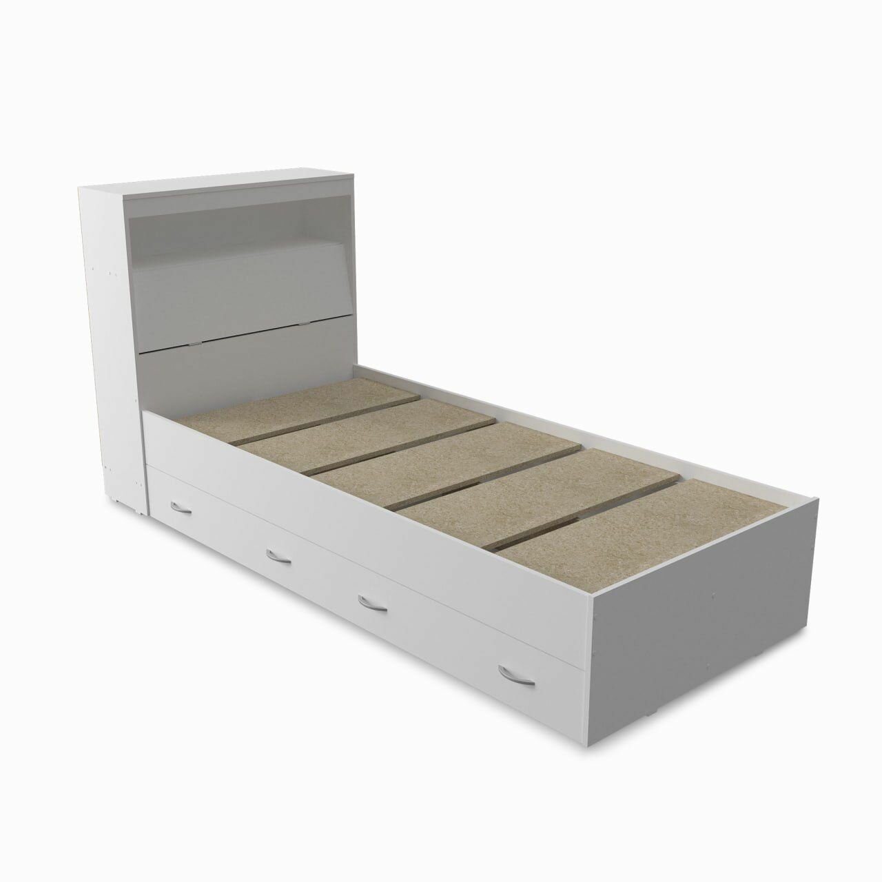 Купить Белая односпальная кровать 90 х 200 с матрасом, ящиком для белья, закроватным модулем и прикроватным блоком