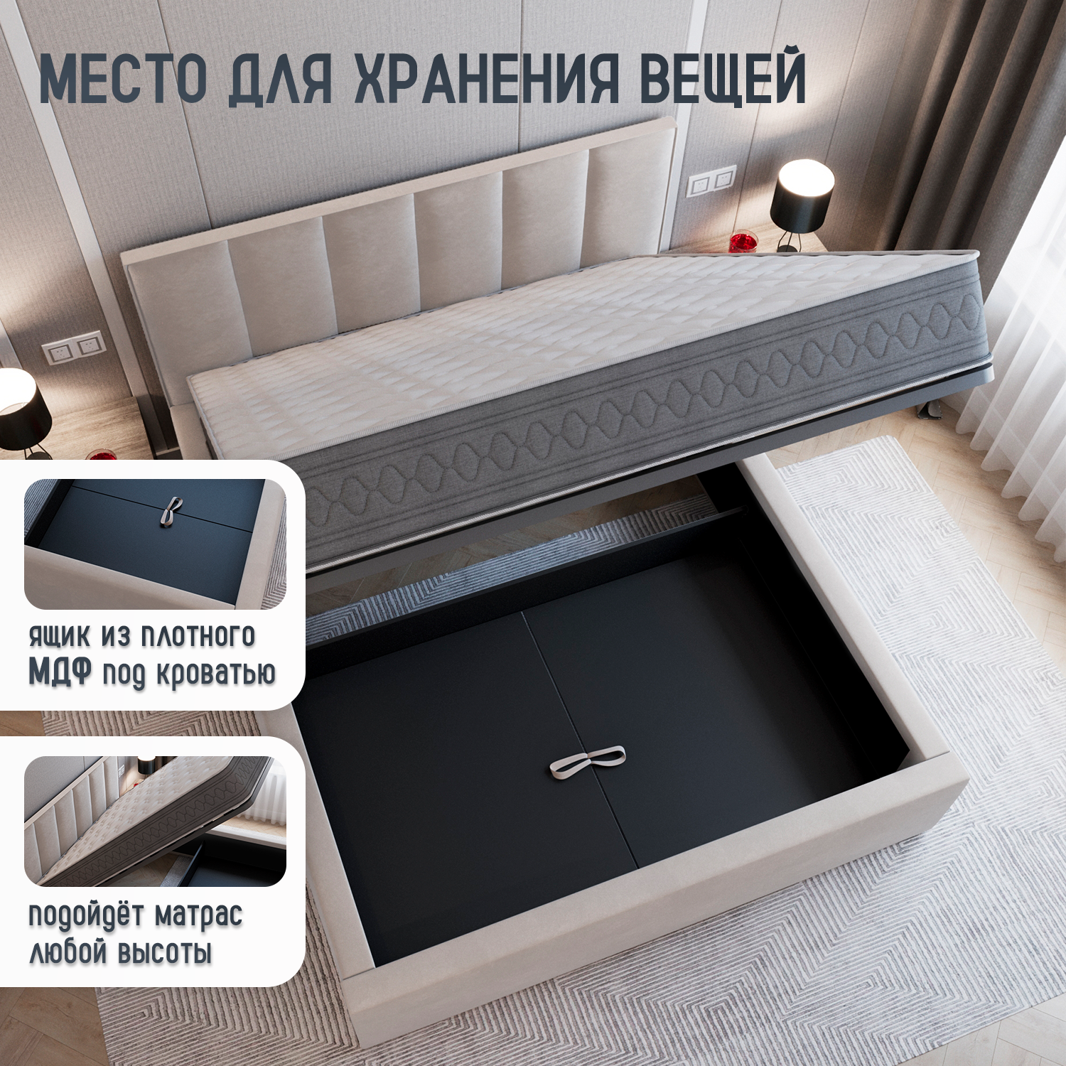 | Особенности | мягкое изголовье, основание под матрас, с изножьем, с подъемным механизмом, с ящиком для белья, усиленная конструкция |
