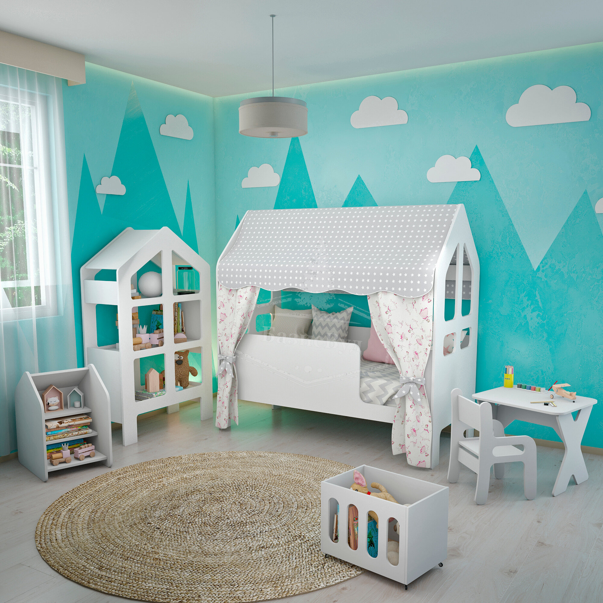Кровать-домик детская спит САМ с бортиком под матрас 160х80, БазисВуд, вход справа,с текстилем (светлый, со зверятами)