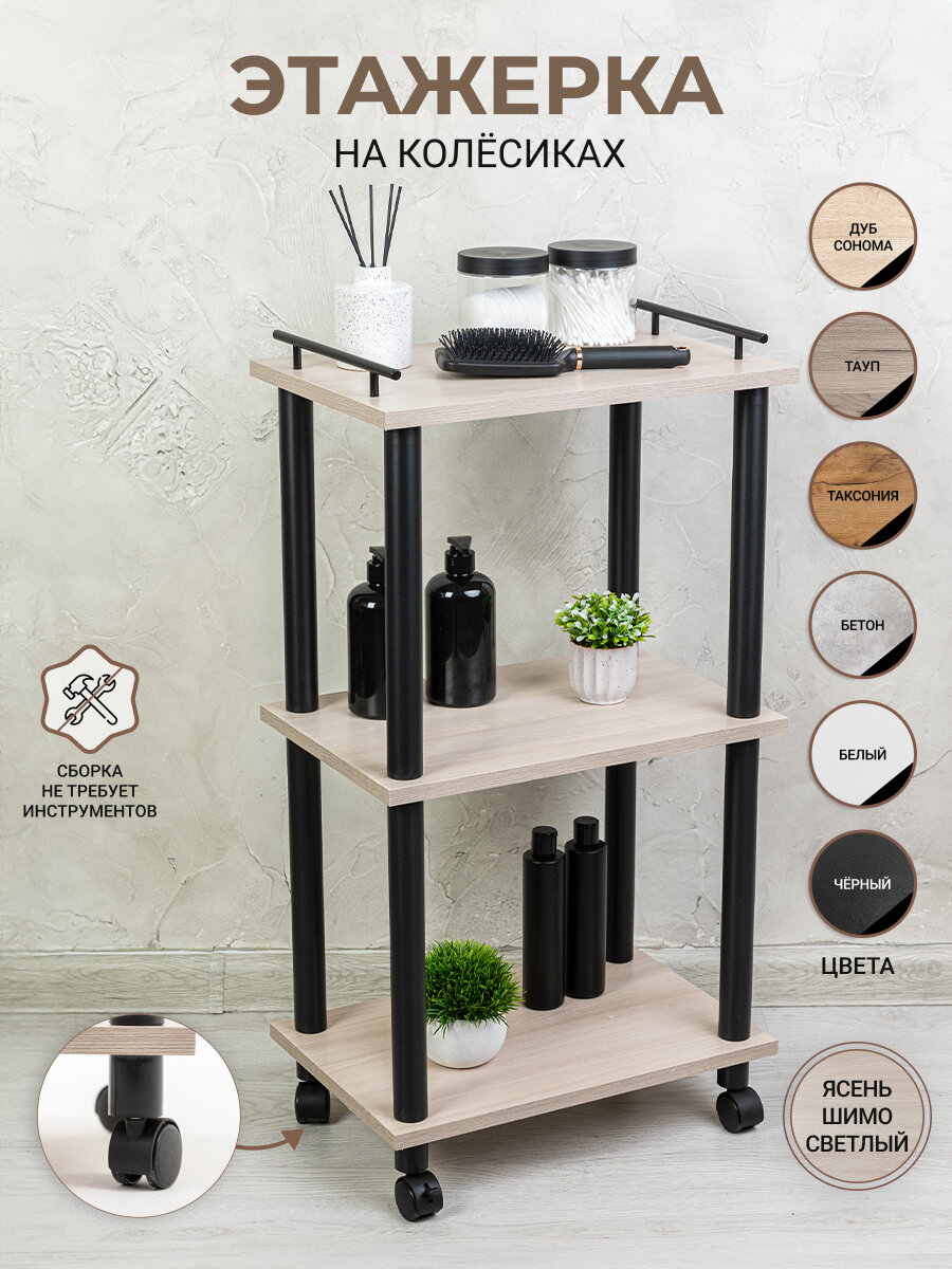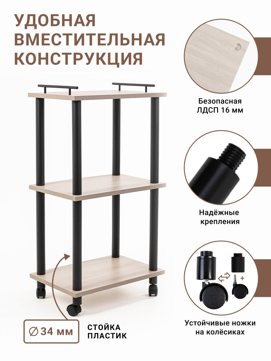 Стеллаж для кухни на колесах GASTRORAG 0770/3, этажерка для ванной на колесиках, тележка косметологическая, 3 полки ЛДСП, размеры 45 х 30 х 82 см