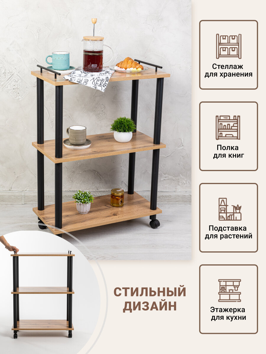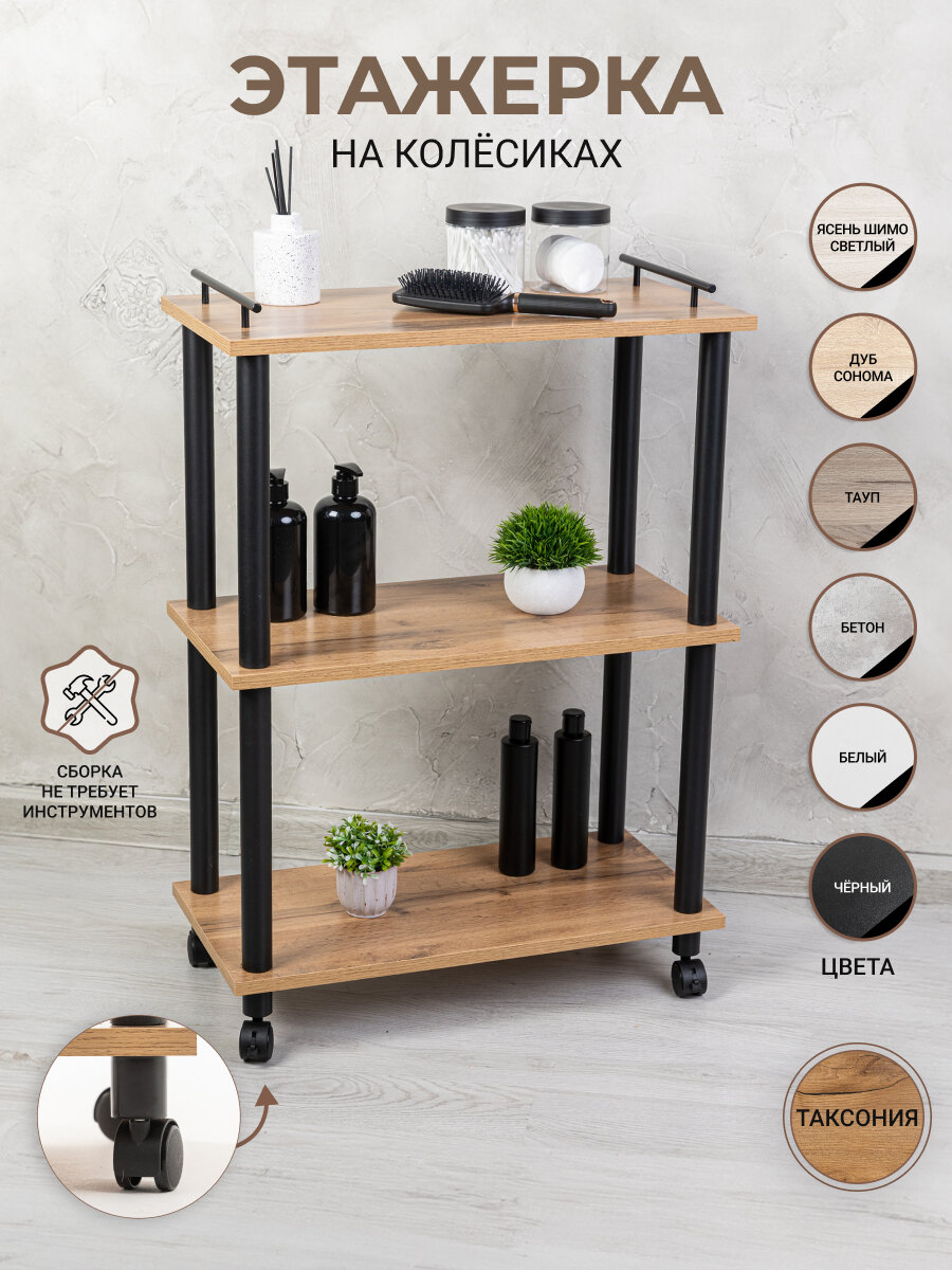 Стеллаж для кухни на колесах GASTRORAG 0770/3, этажерка для ванной на колесиках, тележка косметологическая, 3 полки ЛДСП, размеры 60 х 30 х 82 см
