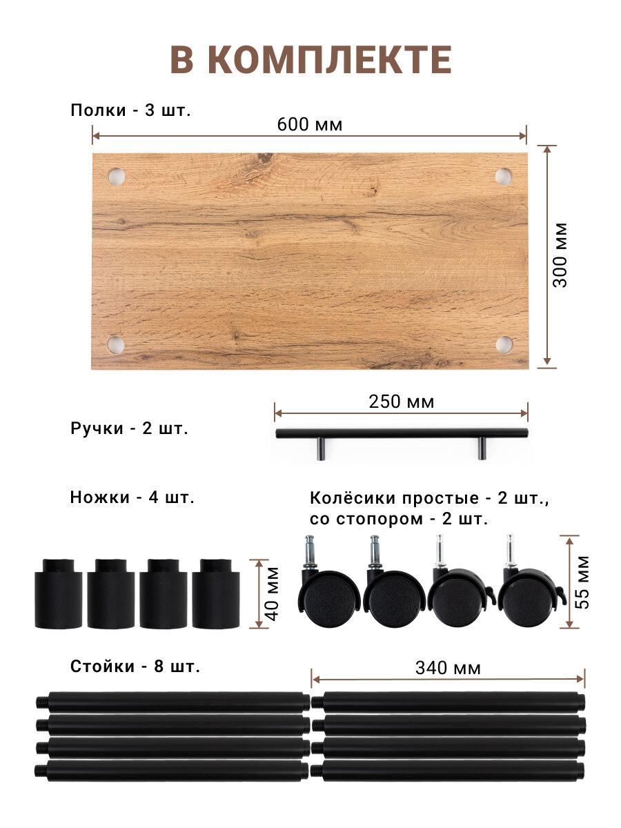| Дополнительная информация | Стойка пластиковая - 8 шт; Полка ЛДСП - 3 шт; колеса из пластика - 4 шт |