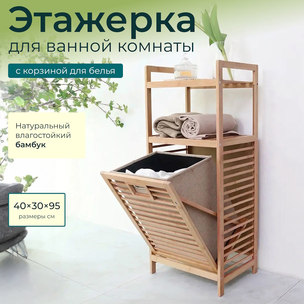 Купить Этажерка для ванной из бамбука, Стеллаж для хранения с корзиной для белья Bambuchka, 40x30x95 см