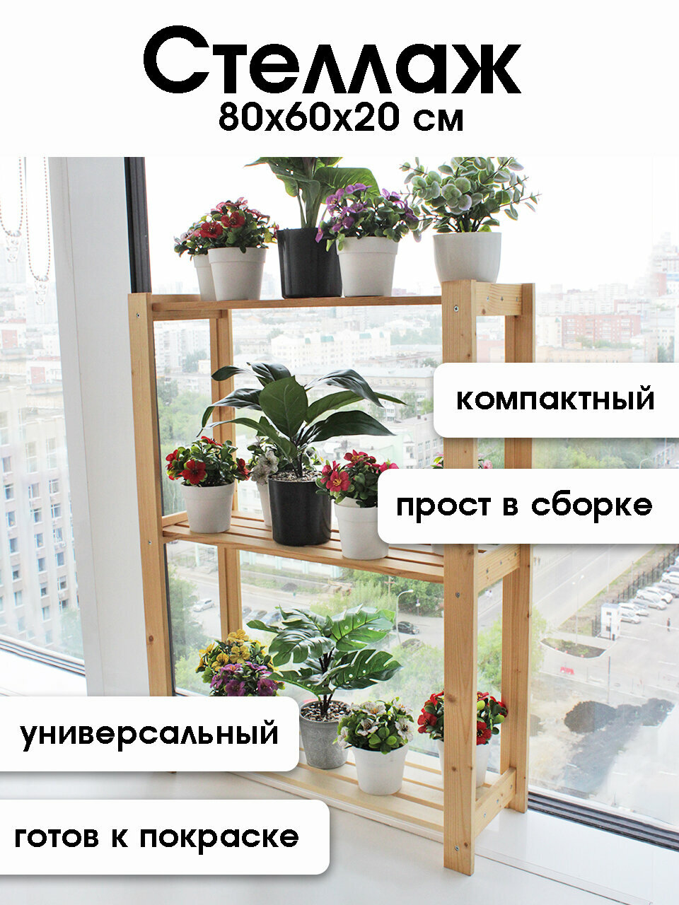 Стеллаж деревянный для дома, для балкона - 3 полки / массив сосны