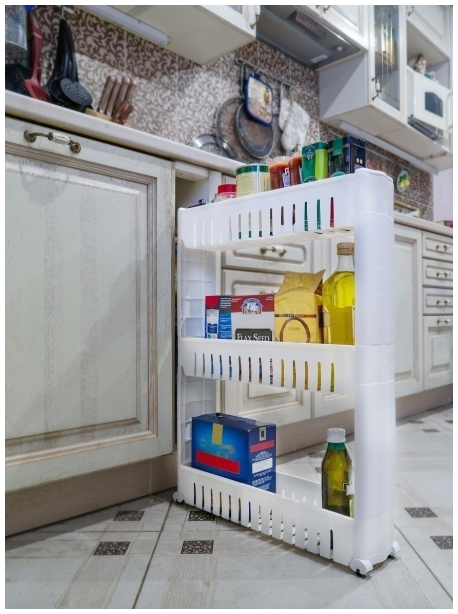 Этажерка KROFFOS Alma полка 3-х ярусная выдвижная на колёсиках интересное: