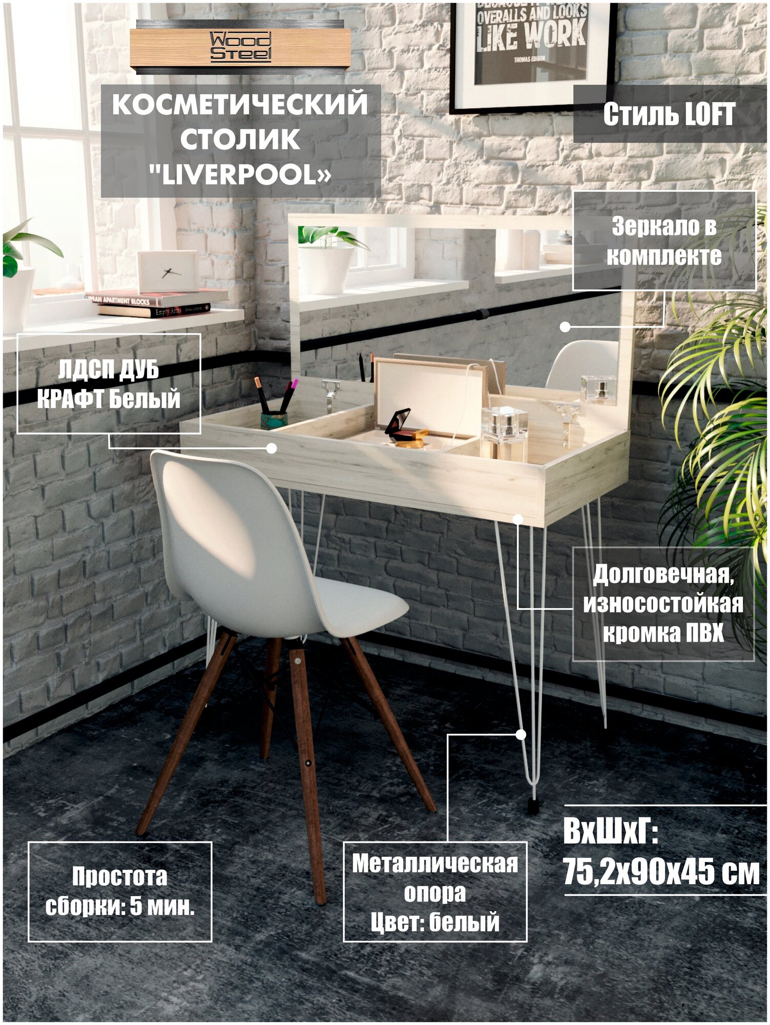 Косметический столик с зеркалом в стиле Лофт "Liverpool" 75,2х90х45 см. Белый интересное: