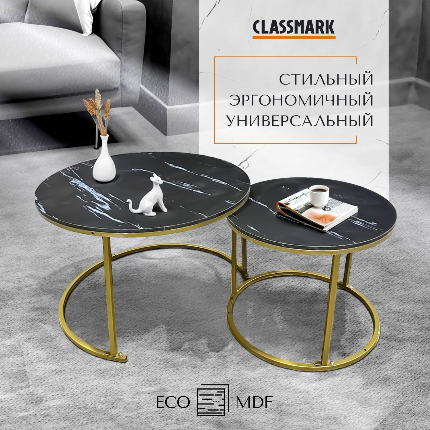 Журнальный столик круглый черный Classmark кофейный стол в гостинную и чайный, прикроватный лофт, МДФ, в комплекте 2 шт, 70 45 см и 50 38 см, цвет мрамор, золото интересное: