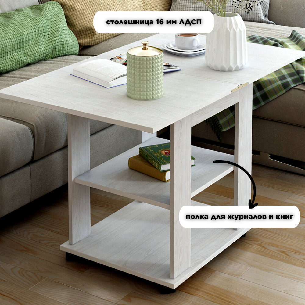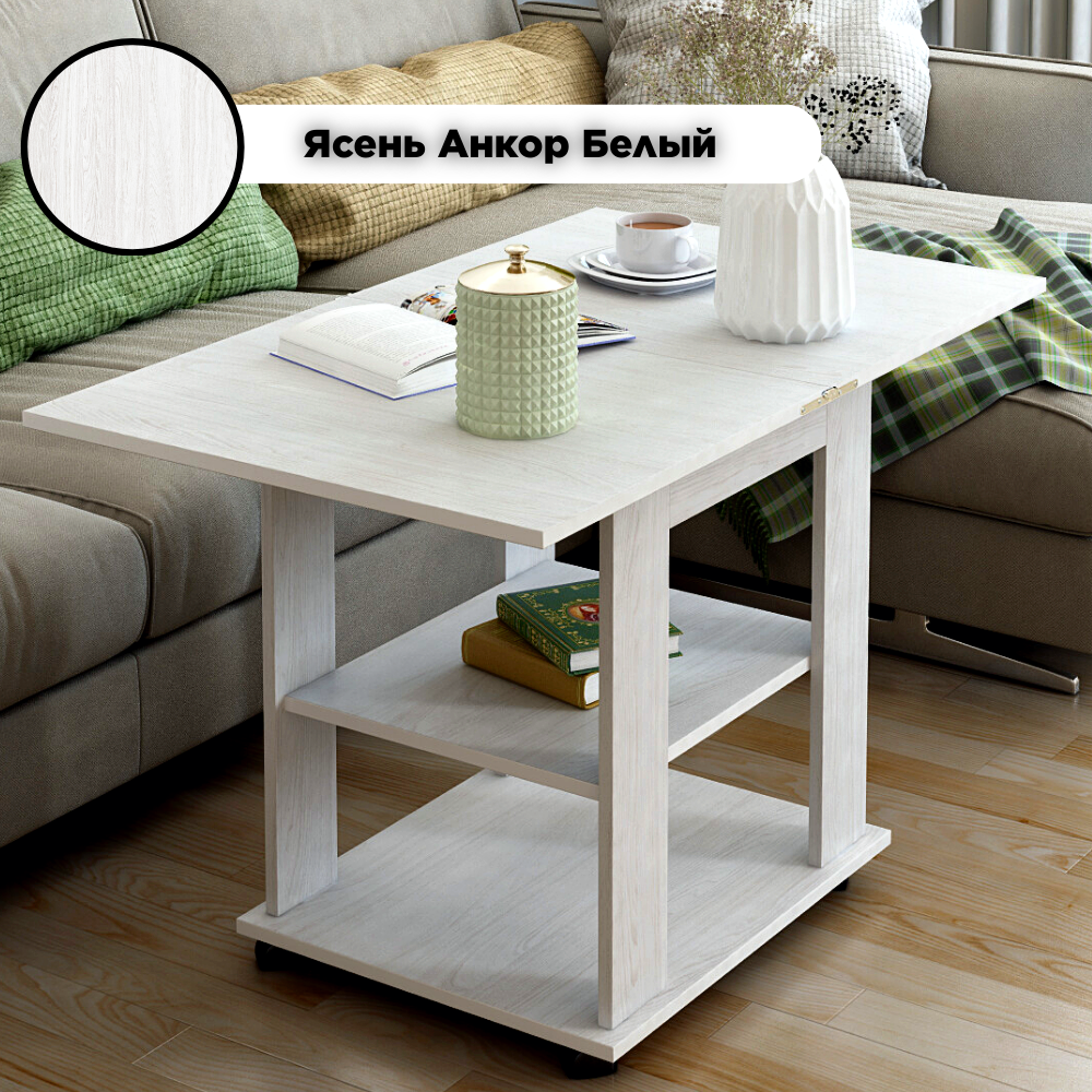 Журнальный стол раскладной прямоугольный 50х60 (100х60) для дома, мебельный цвет ясень анкор белый, ЛДСП, КЕА