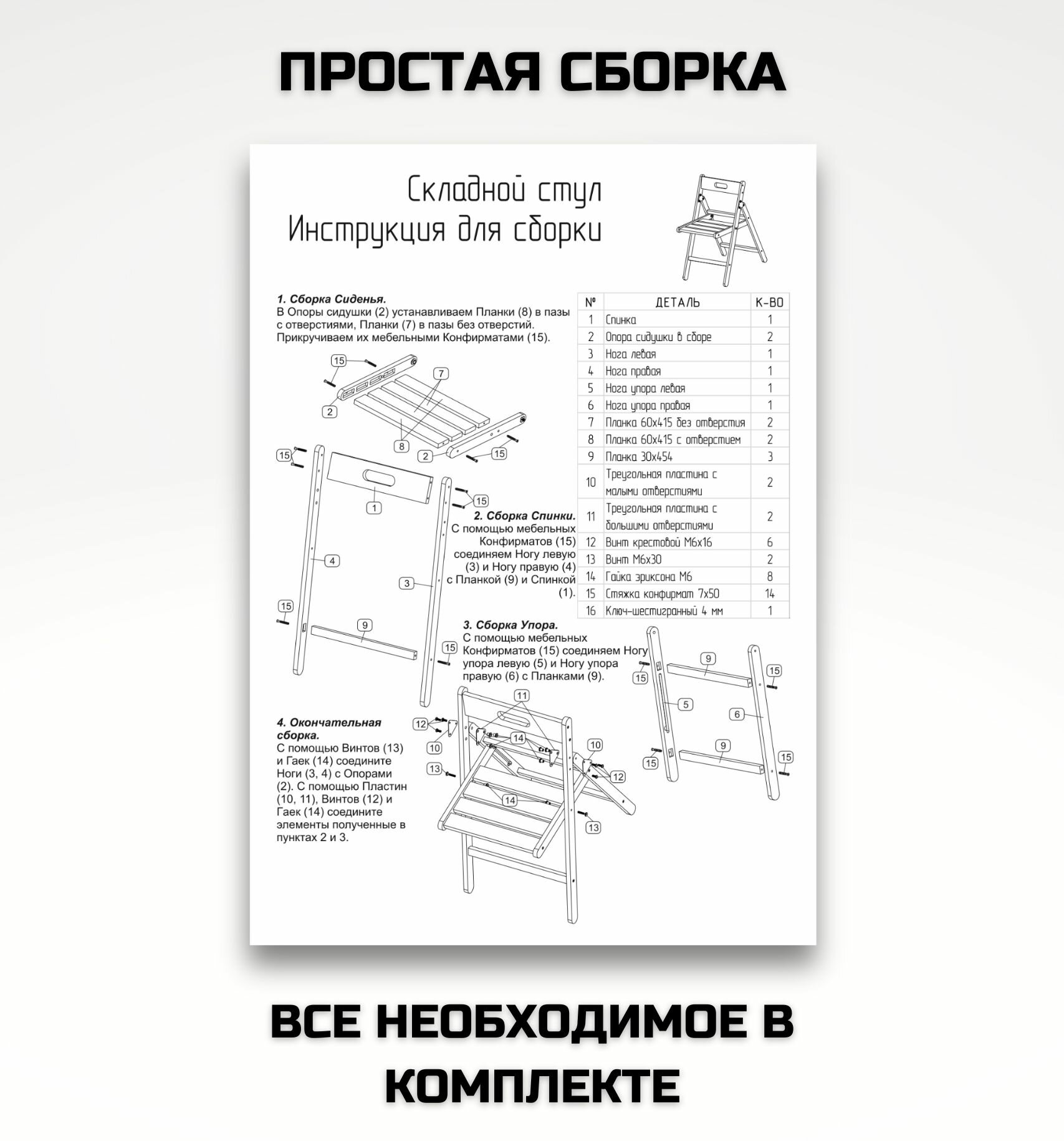 | Комплектация | стул складной, инструкция по сборке, метизы, шестигранник |
