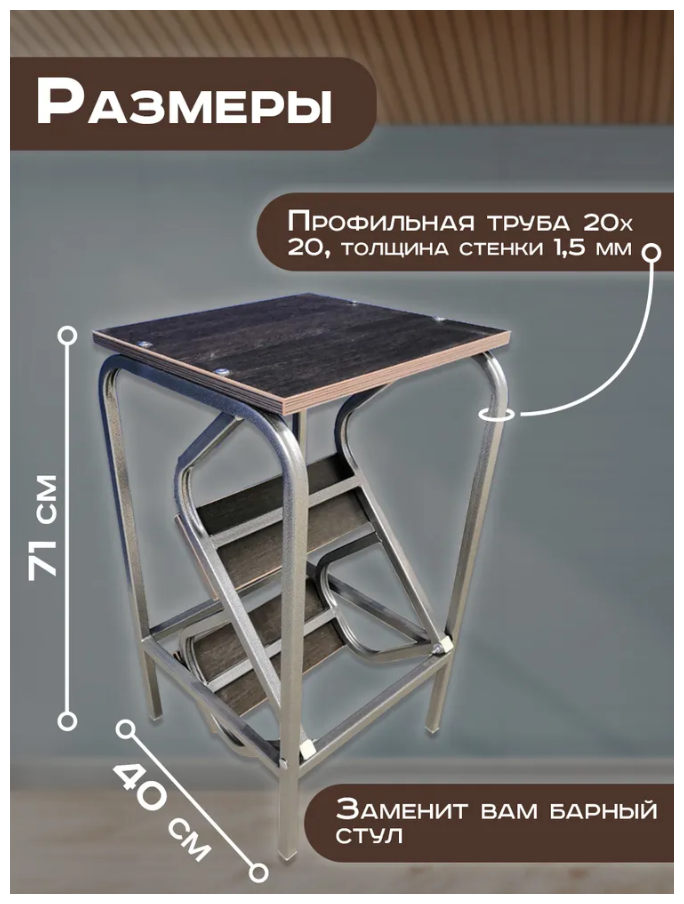 | Дополнительная информация | Основные преимущества компактность, многофункциональность - устойчивый высокий барный стул - невысокая стремянка. Прочная, надёжная, устойчивая прослужит много лет и станет незаменимым помощником. |