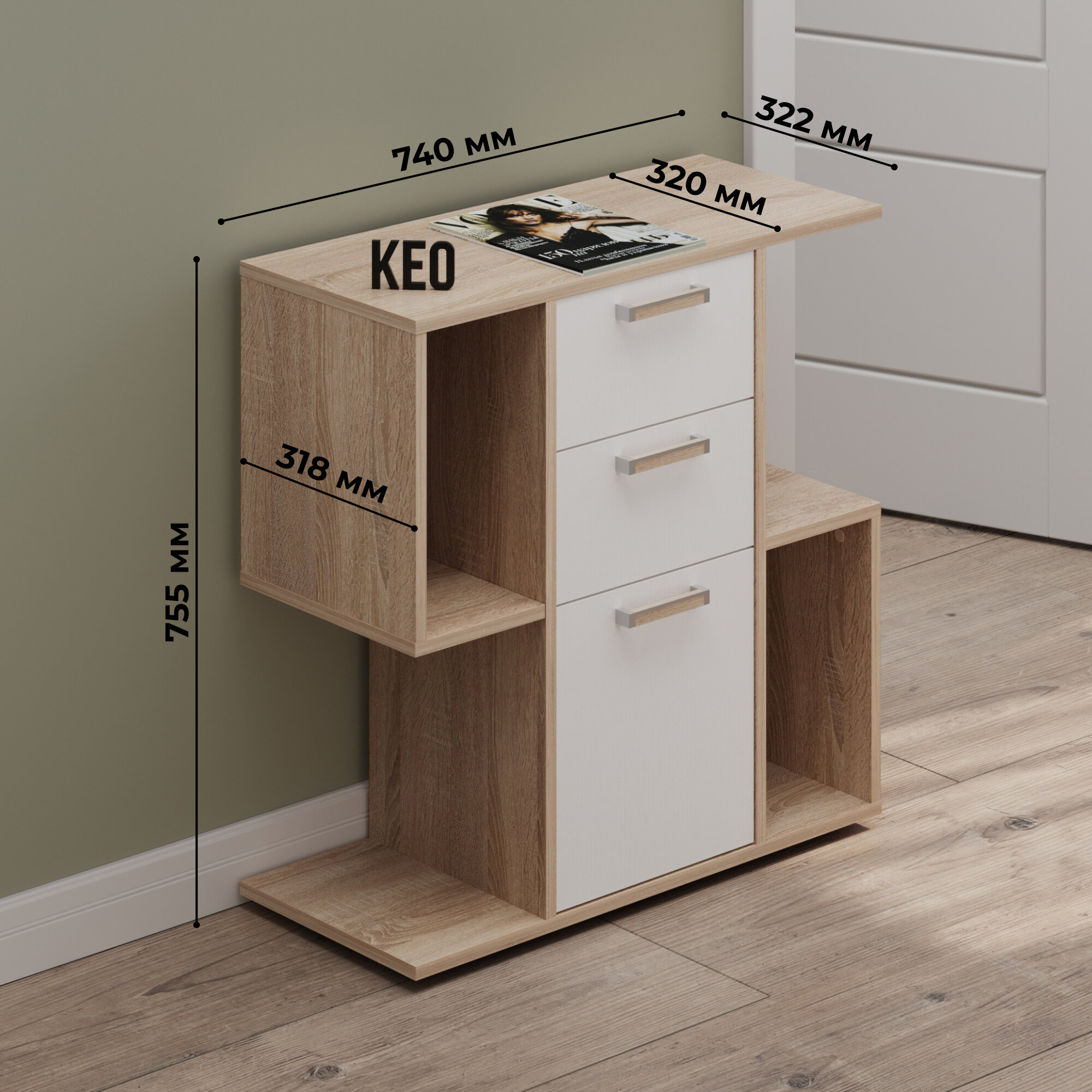 Комод Кео белый и сонома для гостиной и спальни, универсальный, 52х86х29 см