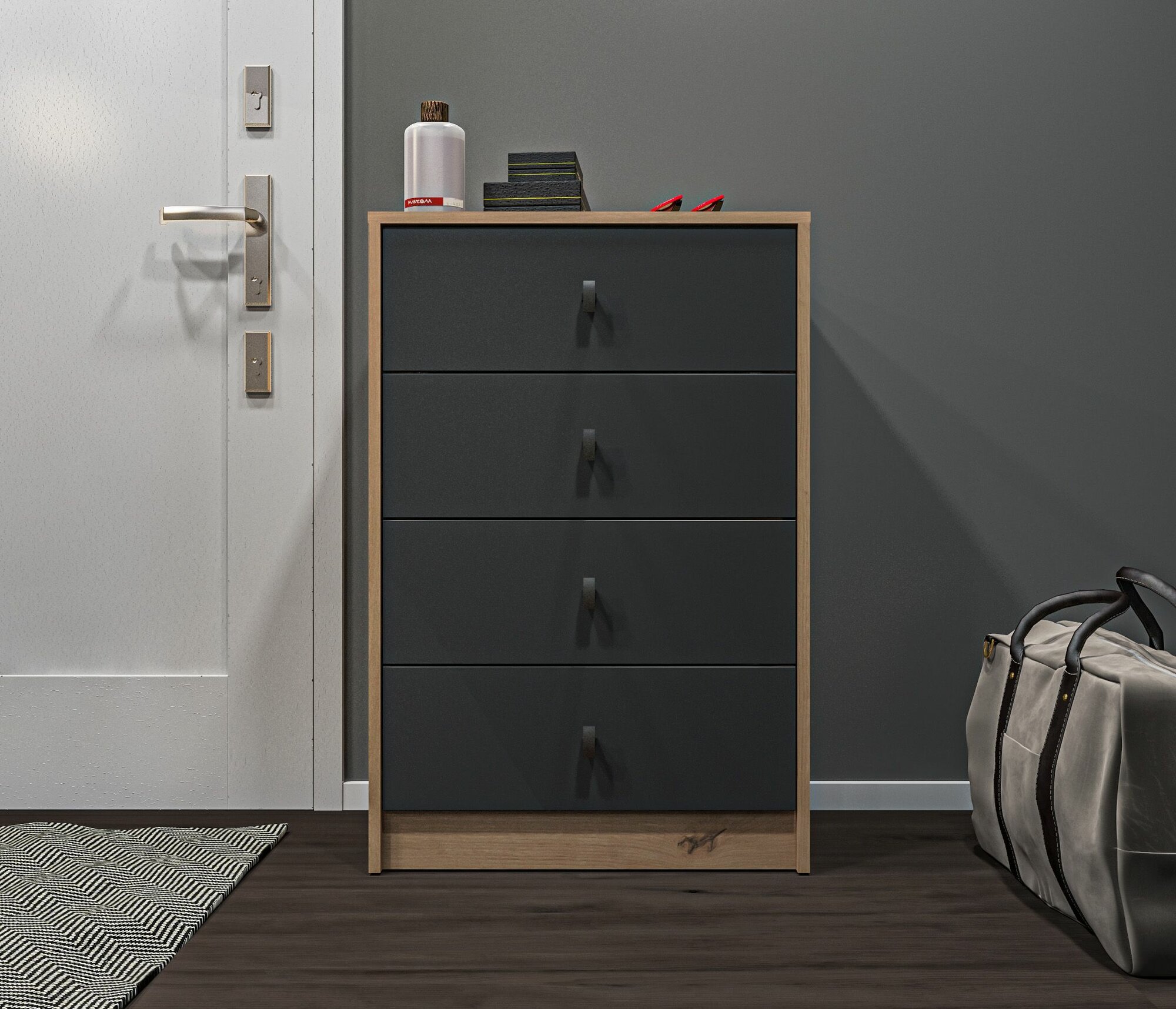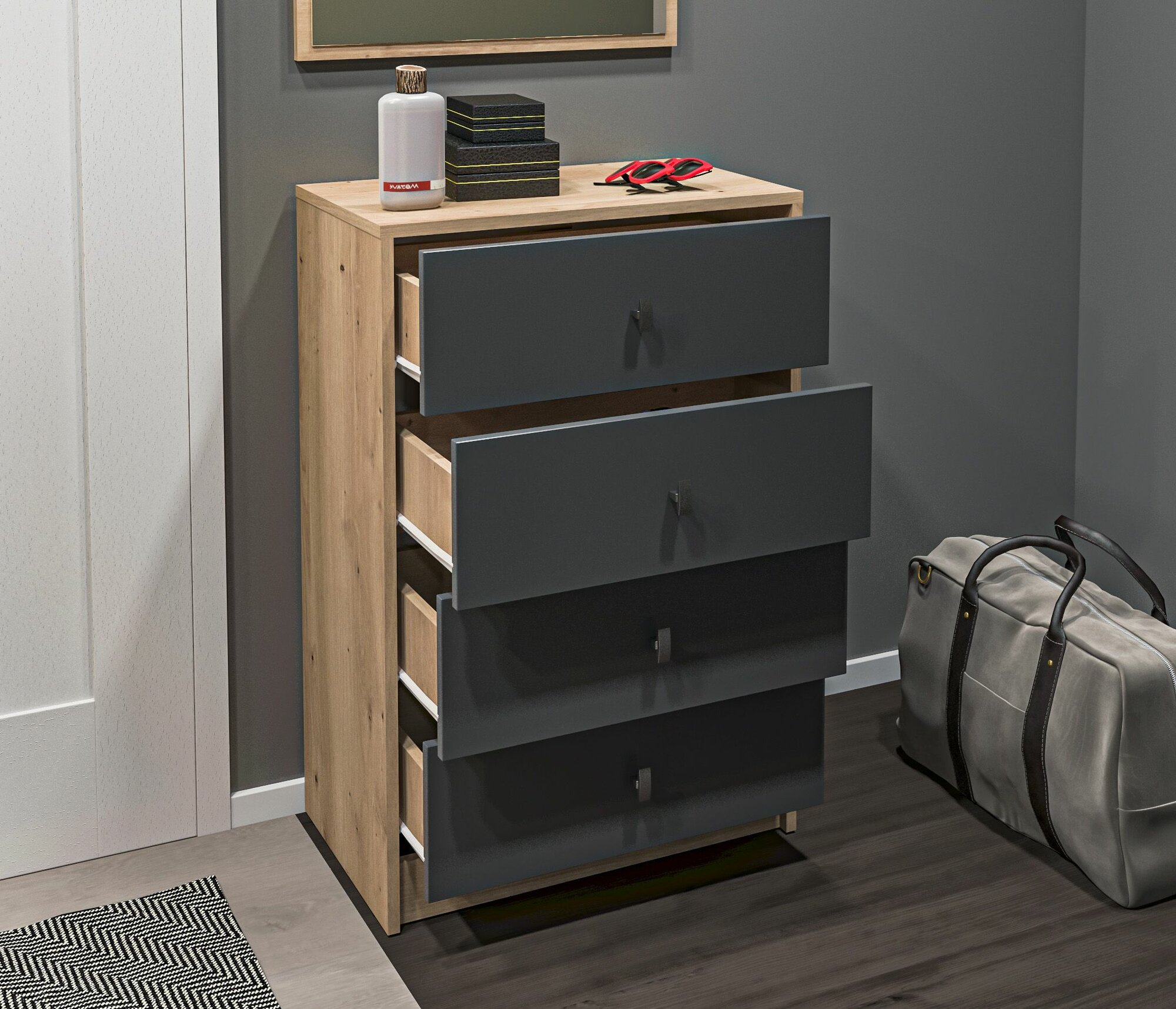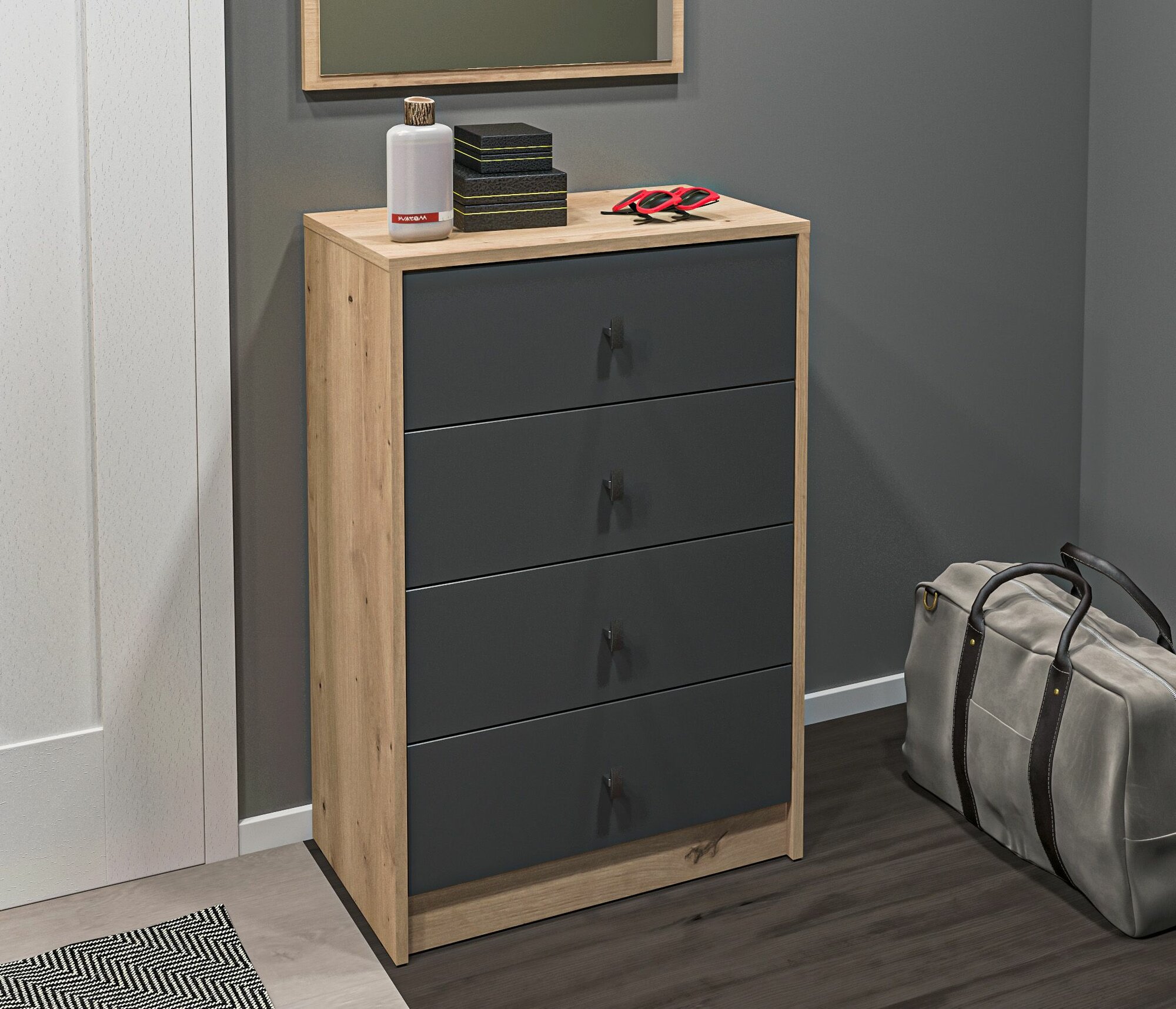Комод столплит Сидней СБ-2586/1 с четырьмя ящиками, для хранения вещей, одежды, документов, канцелярии, в комнату, в спальню, в детскую, в прихожую, в гостиную, в кабинет, в офис, на дачу, на балкон, ДСП Дуб дикий/Диамант серый, 60х90х35 см интересное: