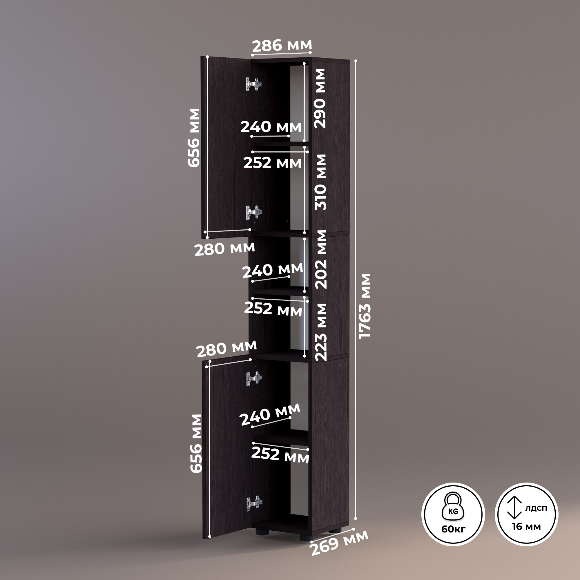 Купить Шкаф пенал напольный с полками для ванной прихожей балкона Кео ПН-100 дуб венге 1763х269х286 мм