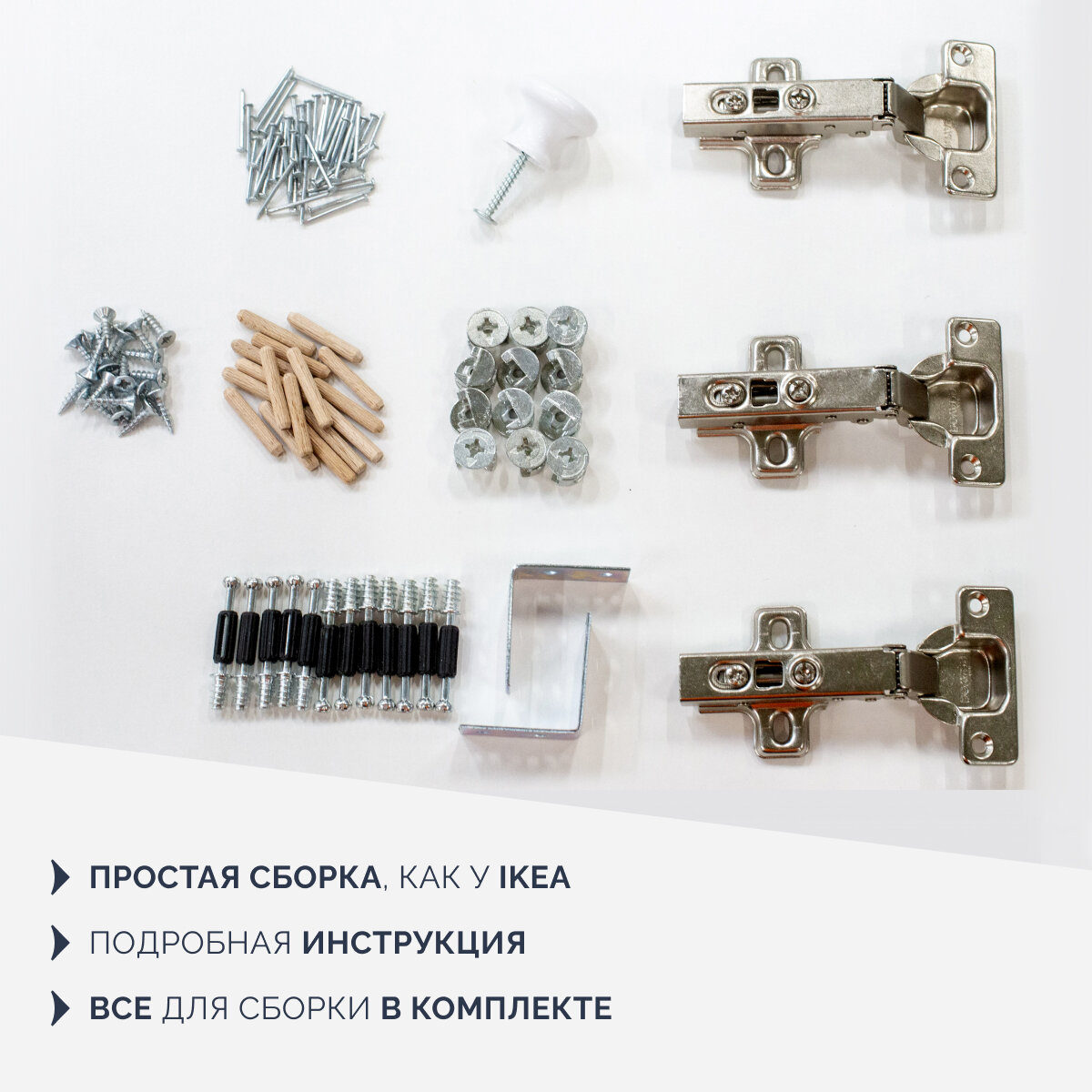 | Комплектация | Боковина – 2 дет., перегородка – 1 дет., верх и основание – 2 дет., плинтус – 1 дет., полка большая – 1 дет., полка малая – 3 дет., дверь – 2 дет., евровинт конфирмат стальной – 4 шт., стяжка эксцентриковая (комплект шток + эксцентрик) – 12 шт., штанга выдвижная 300 мм – 1 шт., шкант 5х30 деревянный – 16 шт., ключ шестигранный – 1 шт., гвоздь – 60 шт., полкодержатель металлический – 12 шт., ручка кнопка с винтами в комплекте – 2 шт., петля мебельная для накладной двери – 6 шт., саморез с потайной головкой – 32 шт., уголок – 2 шт., стенка задняя ДВПО – 1 шт., инструкция по сборке и эксплуатации – 1 шт. |