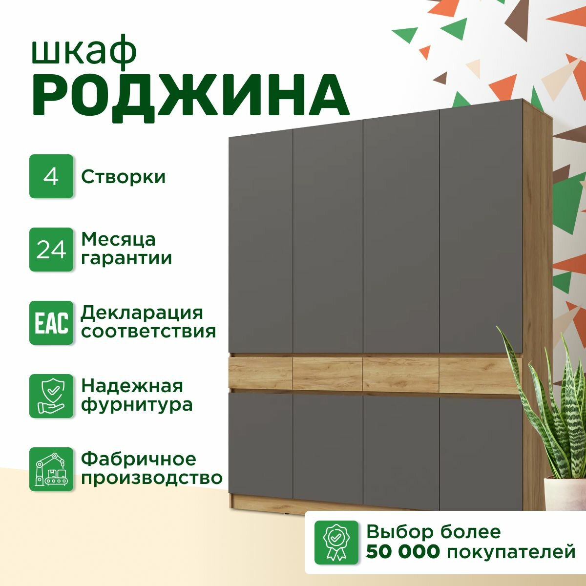 Шкаф распашной Роджина 4-створчатый, дуб крафт/графит, 199,8х52х240см