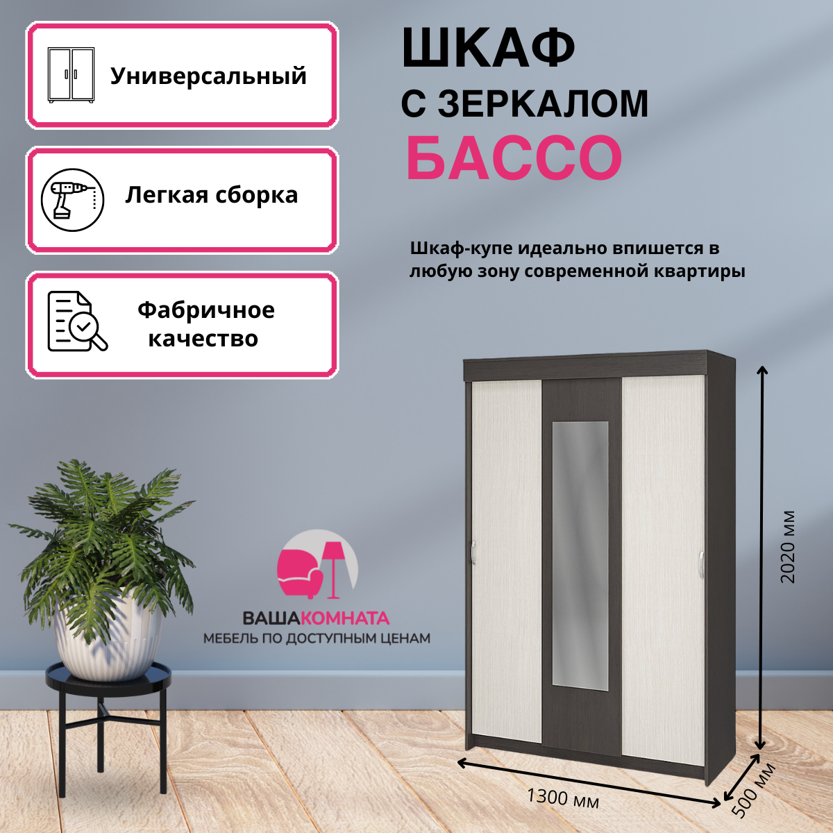 Шкаф-купе Бася/Бассо Венге/Дуб белфорд, ЛДСП с зеркалом, полками, штангой, для прихожей ,спальни, гостиной 1300х500х2020 интерьер-центр