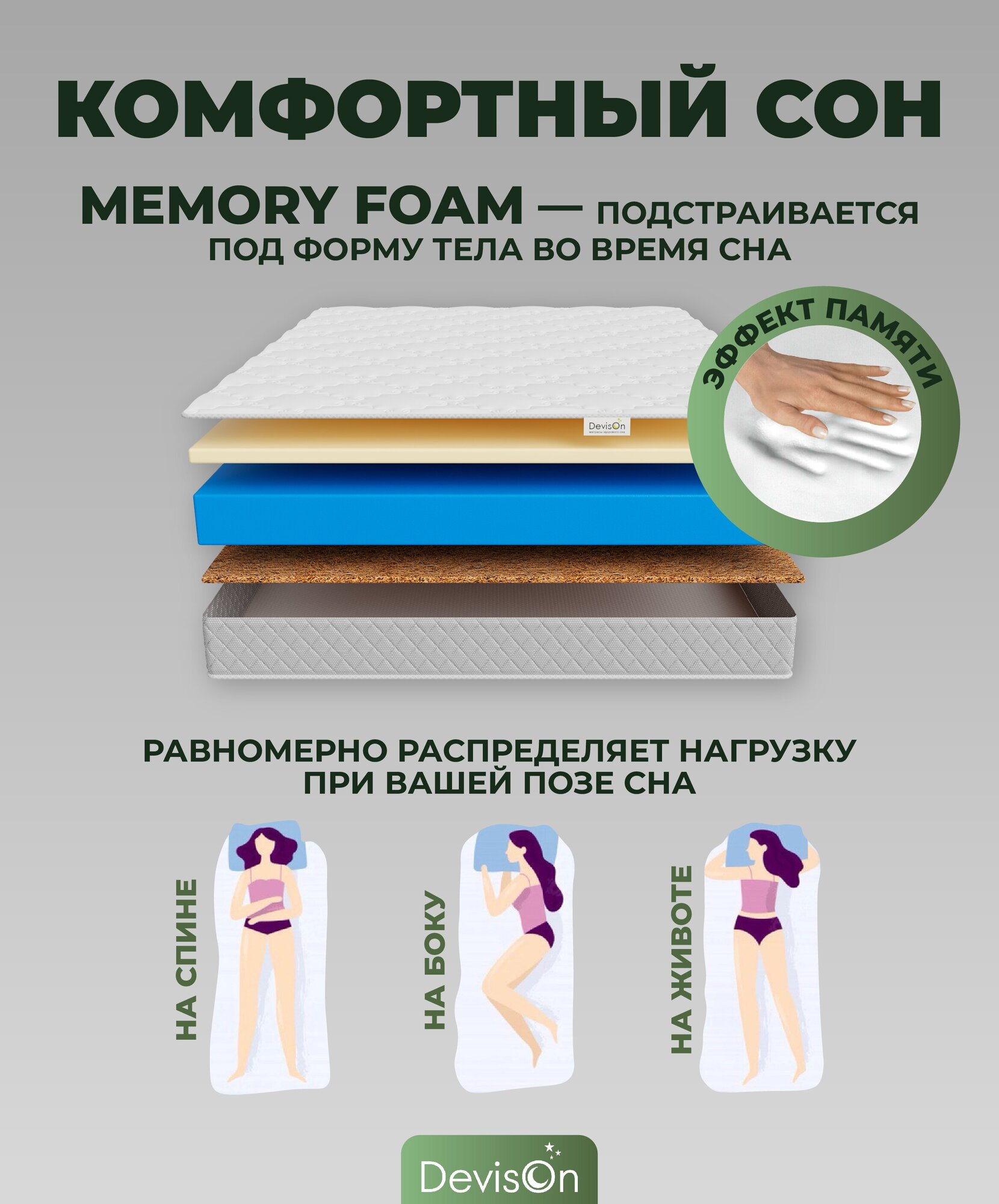 Матрас 160х200 беспружинный ортопедический с эффектом памяти Devison Memory Coconut интересное: