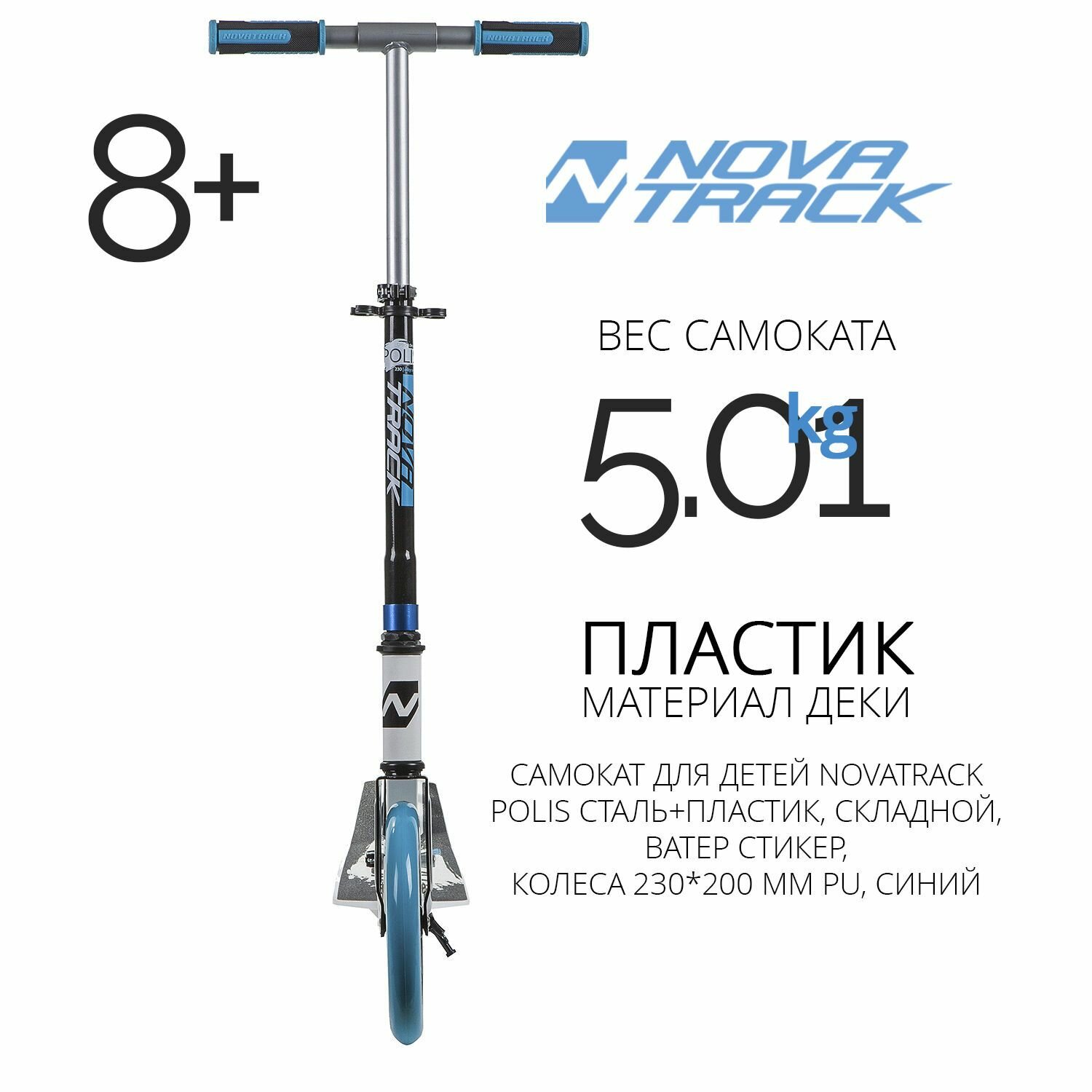 Самокат NOVATRACK POLIS 230 Plastic (2019) (Самокат для детей NOVATRACK POLIS сталь+пластик, складной, ватер стикер, колеса 230*200 мм PU, синий)