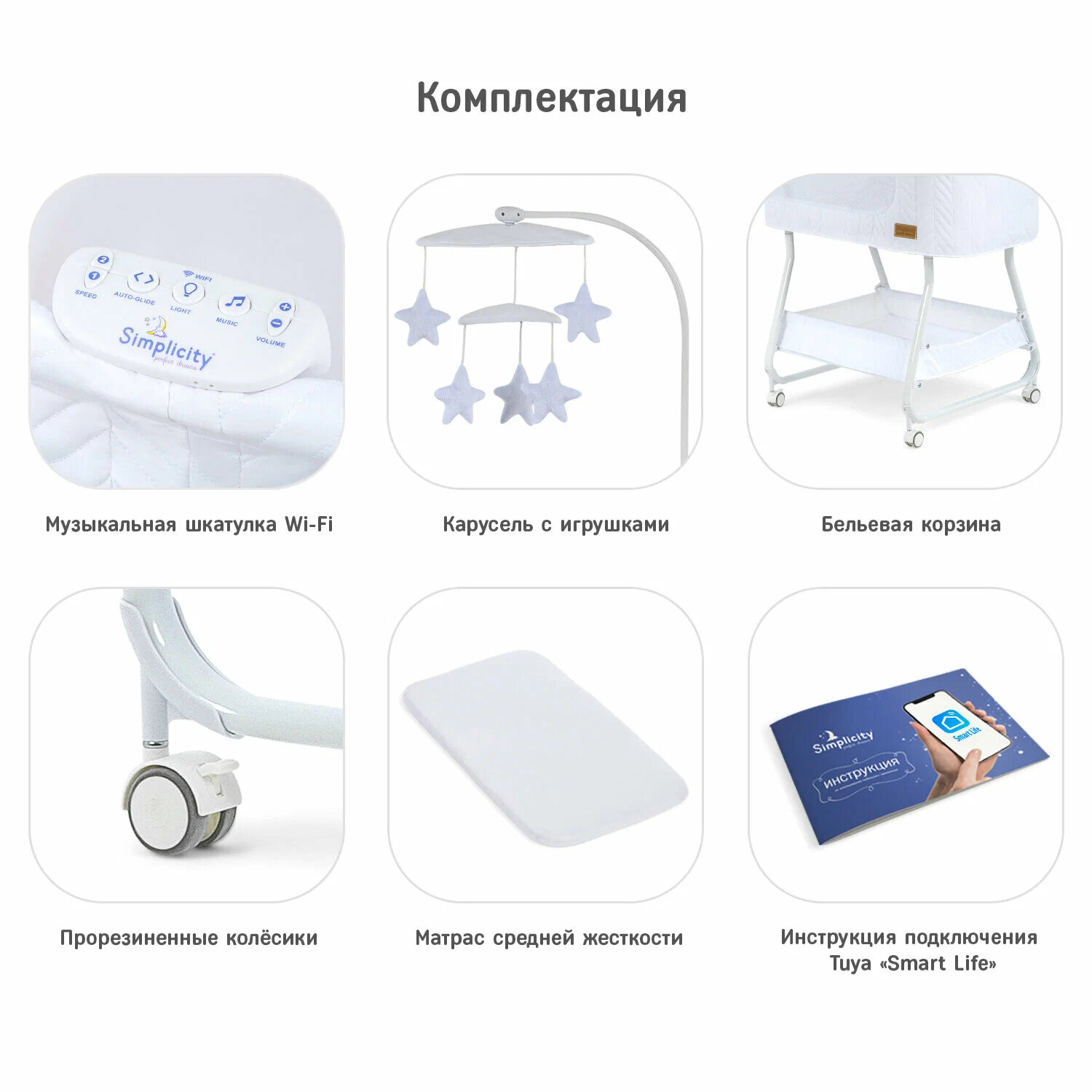 | Дополнительная информация | Колыбель, съёмный матрасик, наматрасник, музыкальная шкатулка, карусель с игрушками, электрошнур с адаптером, тканевая корзина для белья, маятник на магнитной подушке. |