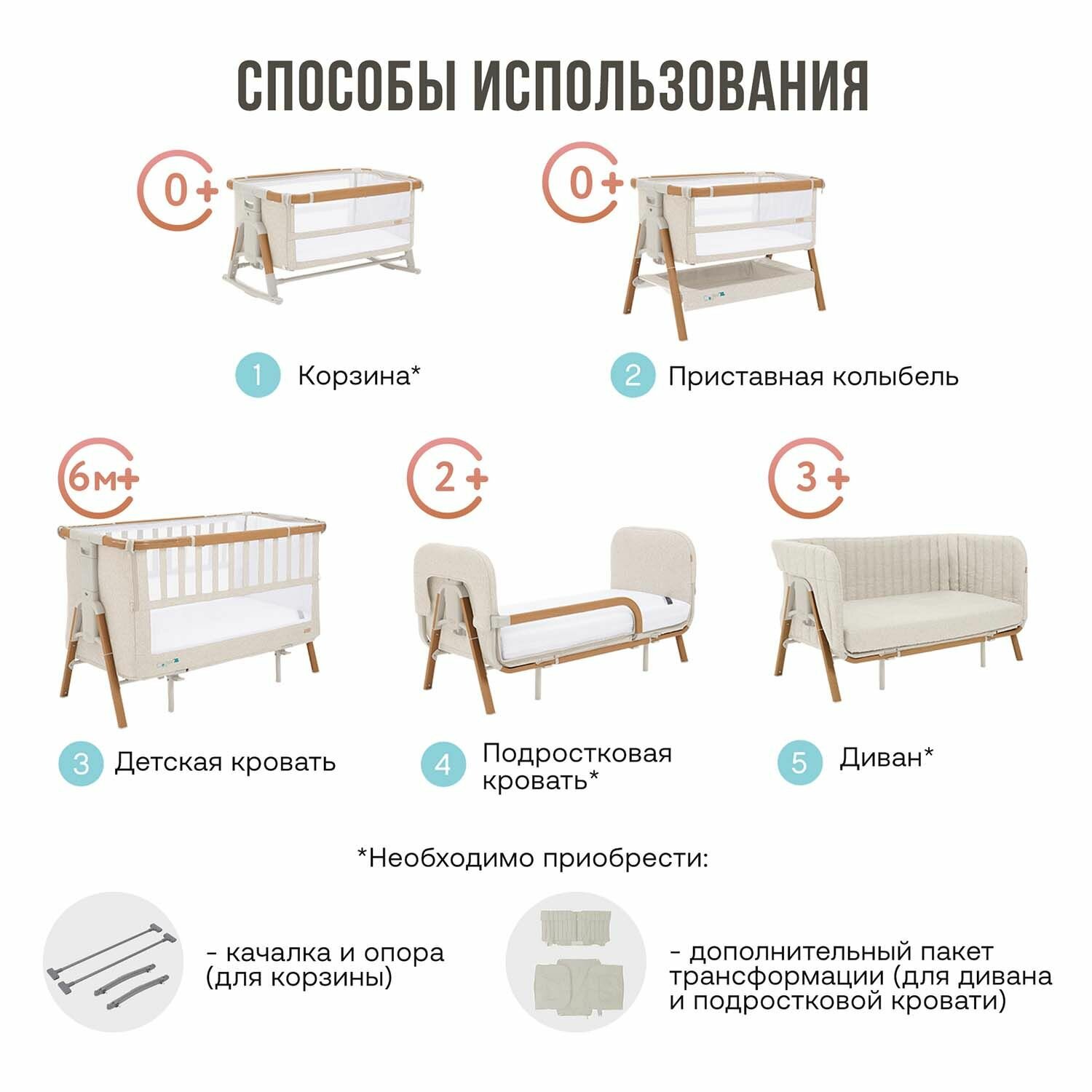 | Комплектация | Расширяемая колыбель/каркас детской кровати 1 комплект / Тканевая обивка для колыбели и кровати 1 комплект / Матрас для колыбели 1 шт / Ремни для крепления к родительской кровати 1 комплект / Сумка для переноски кровати-трансформера 1 шт / Основание матраса для кровати 1 шт / Аксессуары для поддержки кровати 1 комплект |