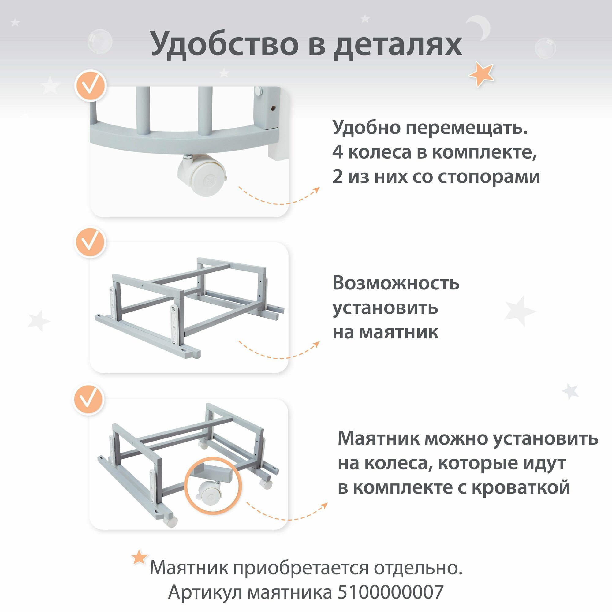 | Комплектация | кроватка / фурнитура / Колёса |