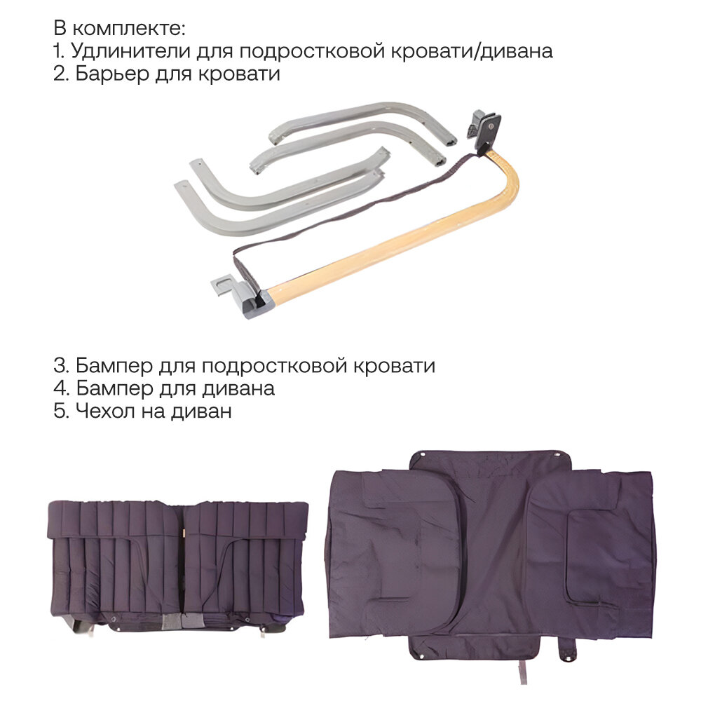 | Комплектация | Удлинители для подростковой кровати/дивана - 1 комплект Бампер для подростковой кровати - 1 шт. Барьер для кровати - 1 шт. Бампер для дивана - 1 шт. Чехол на диван - 1 шт. |