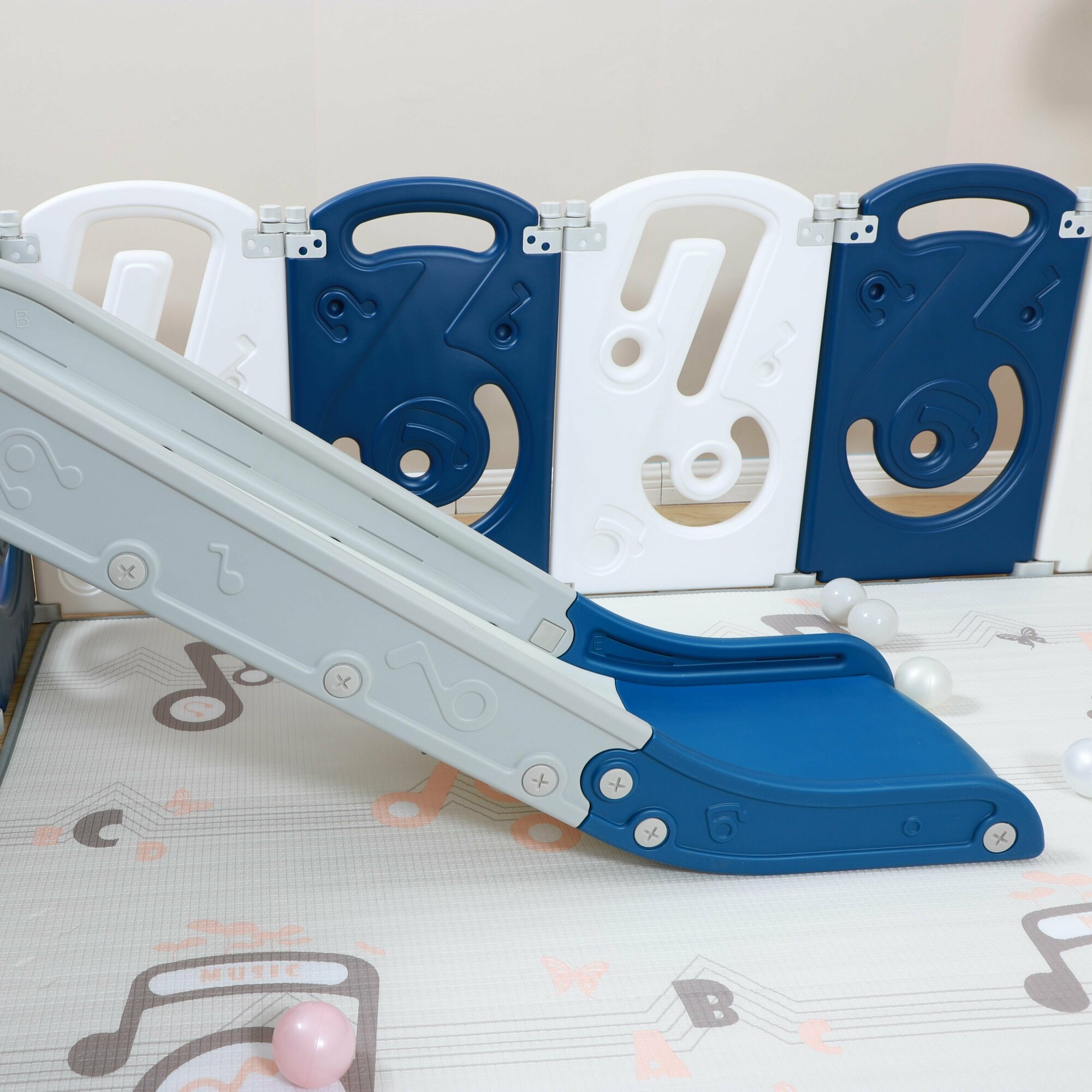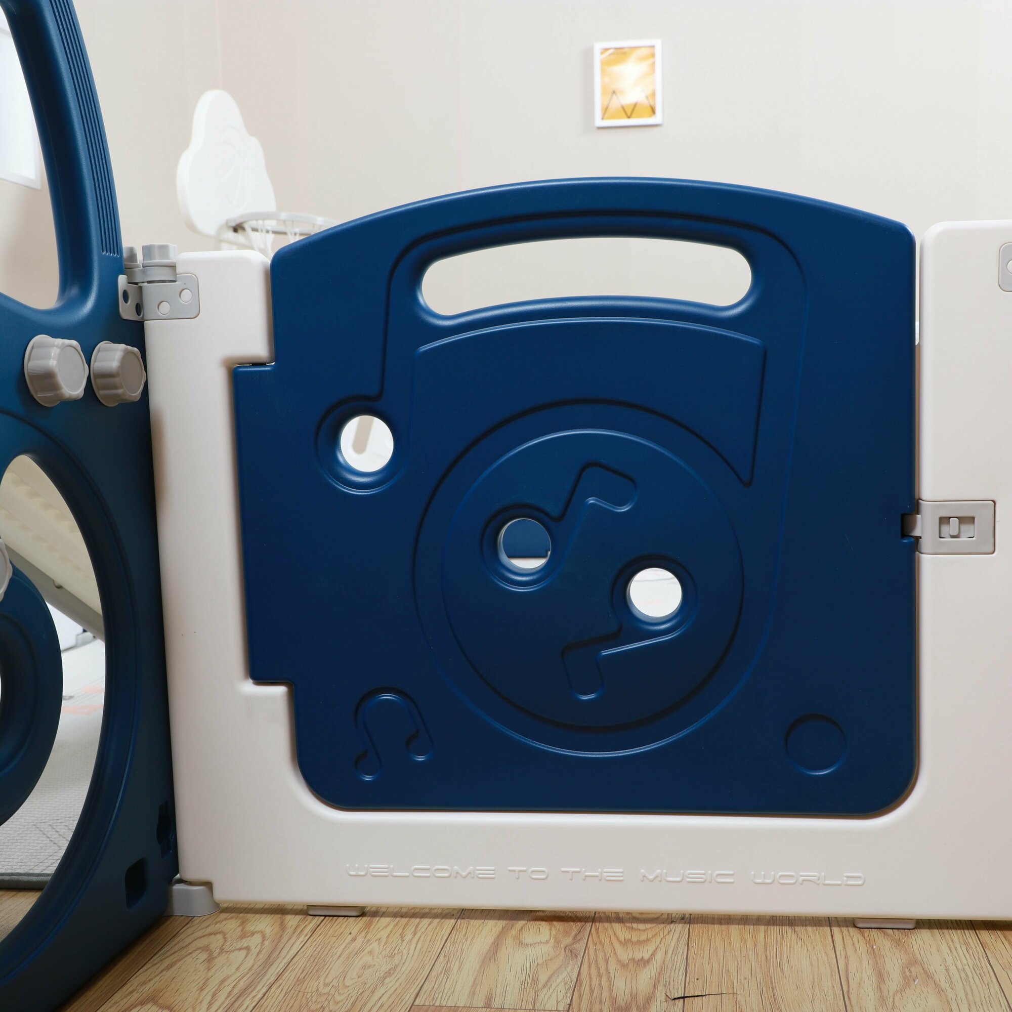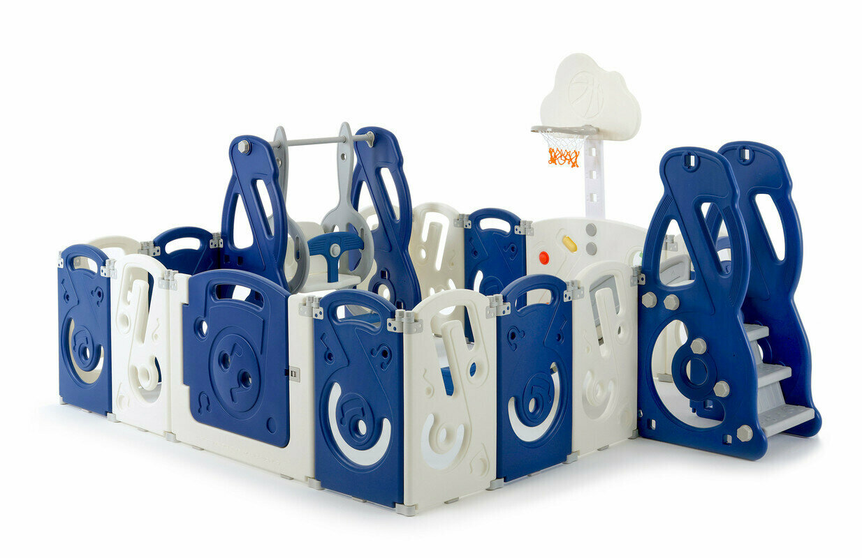 Манеж UNIX Kids "SUPREME Music" Blue с качелями, синий/белый, 200x200 см, с ковриком, горкой, баскетбольным кольцом для дома и улицы интересное: