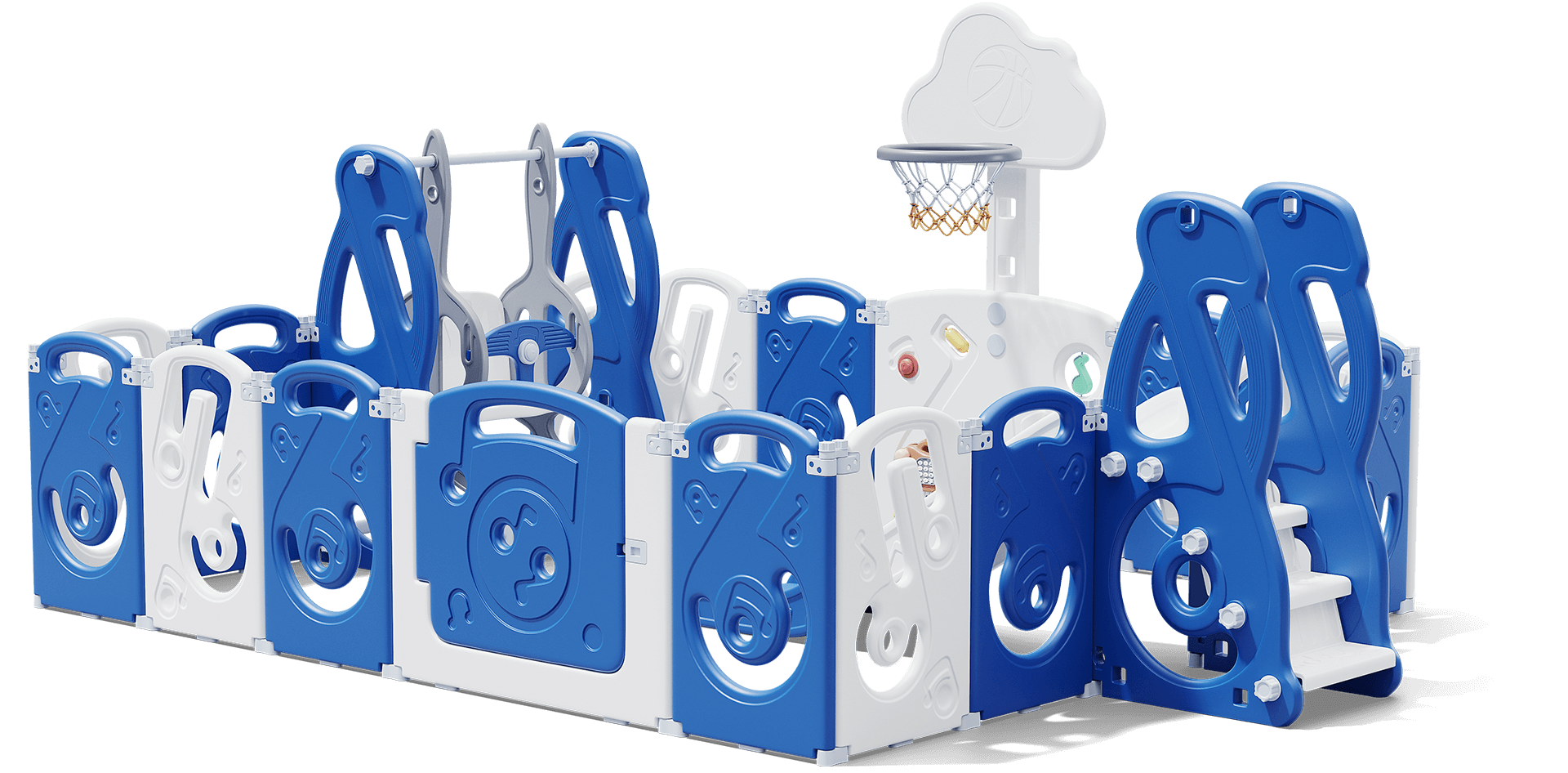Купить Манеж UNIX Kids "SUPREME Music" Blue с качелями, синий/белый, 200x200 см, с ковриком, горкой, баскетбольным кольцом для дома и улицы