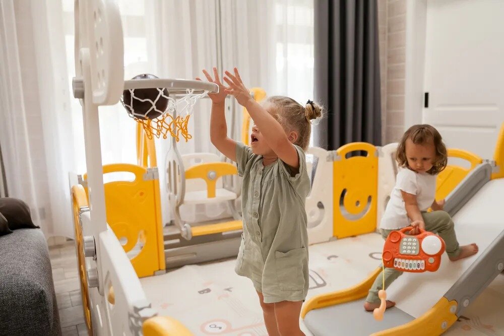 | Комплектация | манеж / коврик / горка / баскетбольная стойка / качели / набор из 30 шариков |