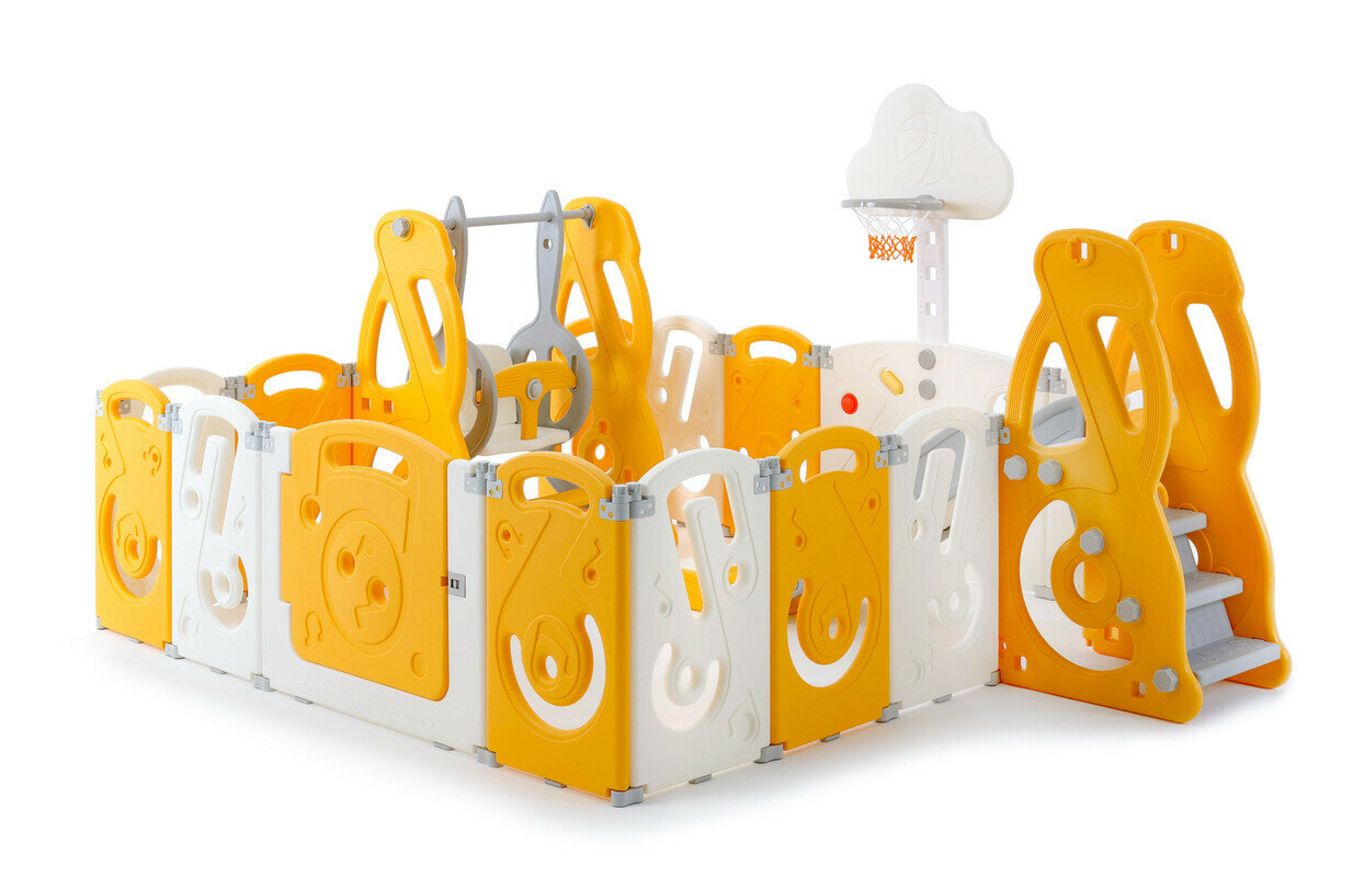 Манеж UNIX Kids "SUPREME Music" Yellow с качелями, желтый/белый, 200x200 см, с ковриком, горкой, баскетбольным кольцом для дома и улицы интересное: