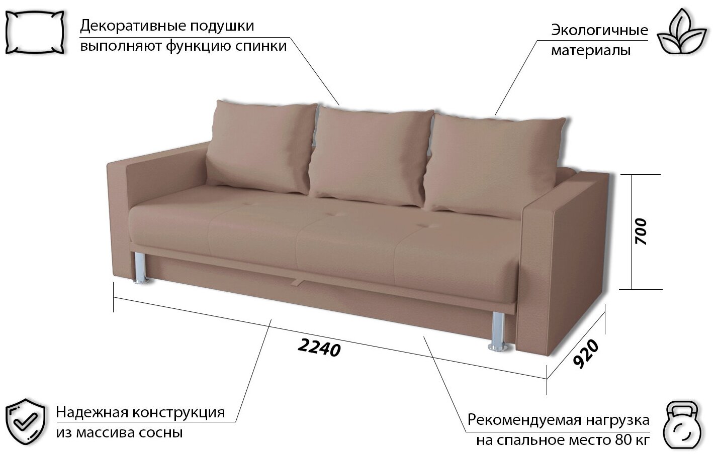 | Дополнительная информация | Диван-кровать предназначен для комфортного оснащения зон отдыха в жилых квартирах и офисах. Сборка: Диван-кровать поставляется в разобранном виде. 1. После распаковки к детали 1(сидение дивана) прикручиваются ножки (входят в комплект). 2. Ножки монтируются на саморезы (входят в комплект) к углам сидения за декоративной планкой. 3. Далее деталь 1 устанавливается в деталь 2 (состоящую из бельевого ящика и опрокидывающейся спинки). 4. Установить подлокотники на крепления типа «салазки». Важно правильно установить деталь согласно направляющим. Оснащен механизмом «еврокнижка». |