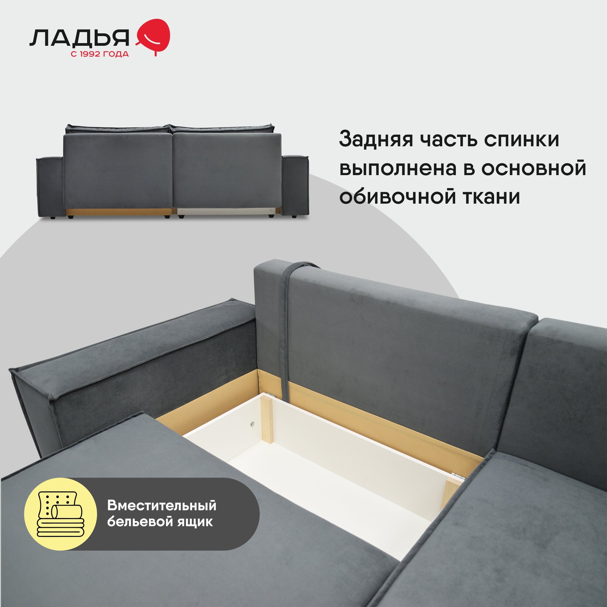 | Особенности | пружинный блок, раскладная конструкция, с подлокотниками, съемные подушки, ящик для белья |