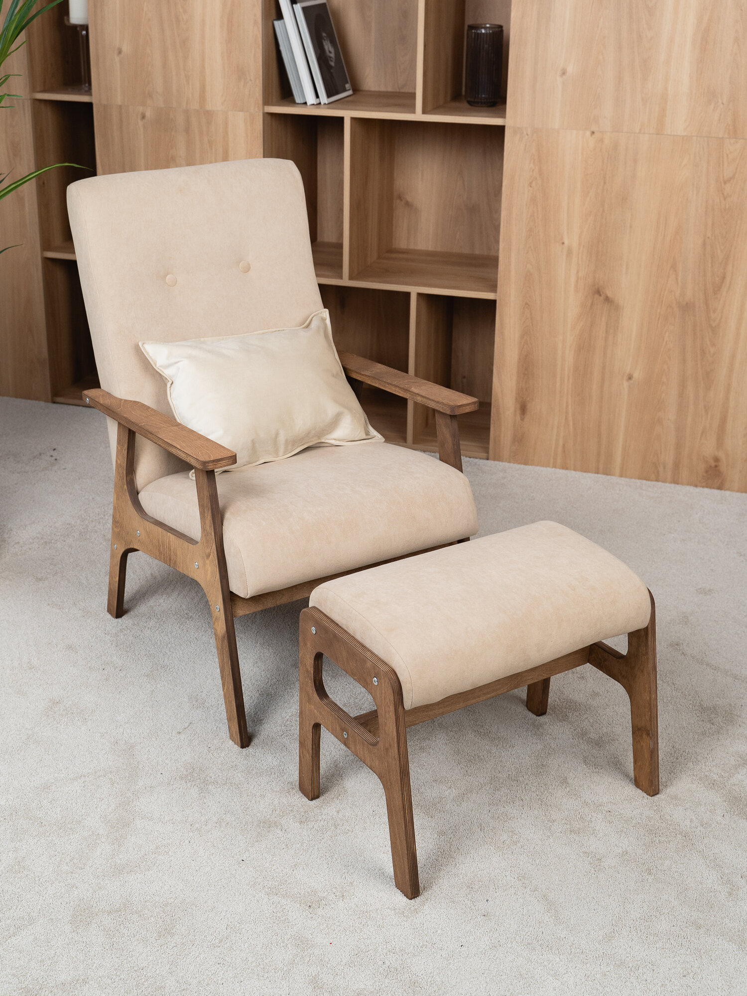 Комплект Чилл ZASIDELIS кресло с пуфом для ног, велюр, темно- бежевый, ноги коричневое масло