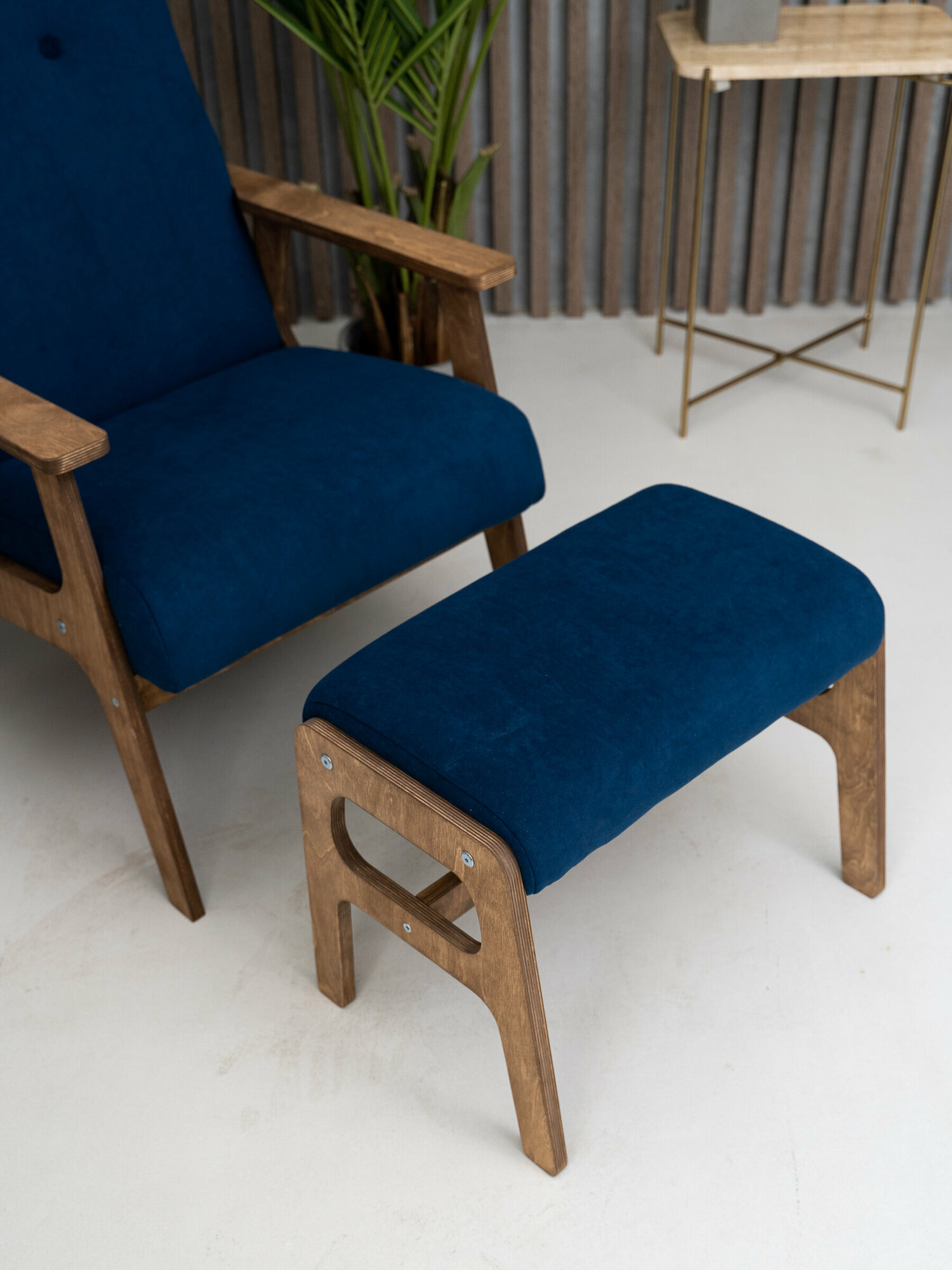 Комплект Чилл ZASIDELIS кресло с с пуфом для ног, велюр, кресло с пуфом синий, ноги коричневое масло