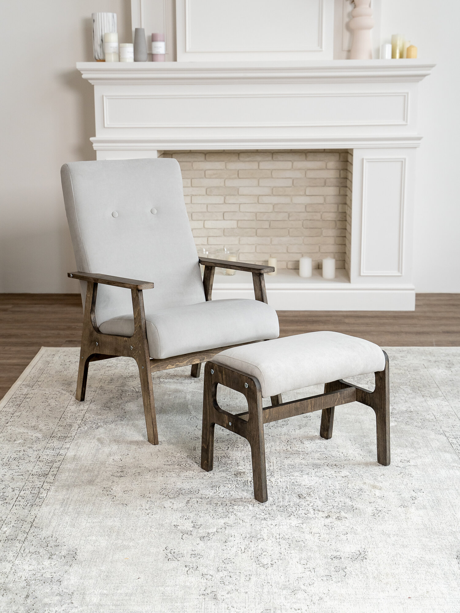 Комплект Чилл ZASIDELIS кресло с пуфом для ног, велюр, светло-серый, ноги коричневое масло
