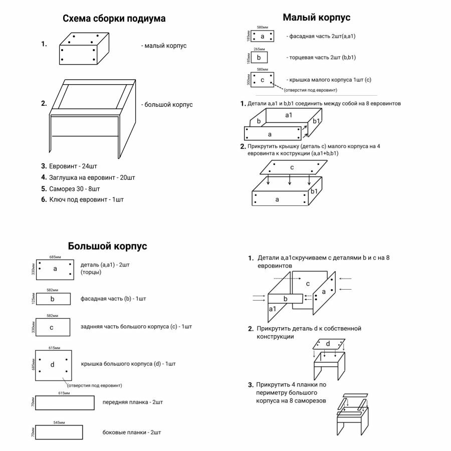 | Подробная комплектация | большой и малый корпус подиума, комплектующие для монтажа, инструкция |