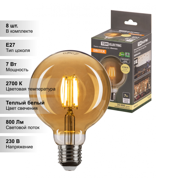Ниже Вы можете прочитать отзывы на (8 шт.) Лампа светодиодная «Винтаж» золотистая G95, 7 Вт, 220 В, 2700 К, E27 (шар) TDM, ознакомится с подробными характеристиками, посмотреть интересные обзоры и фотографии на (8 шт.) Лампа светодиодная «Винтаж» золотистая G95, 7 Вт, 220 В, 2700 К, E27 (шар) TDM.