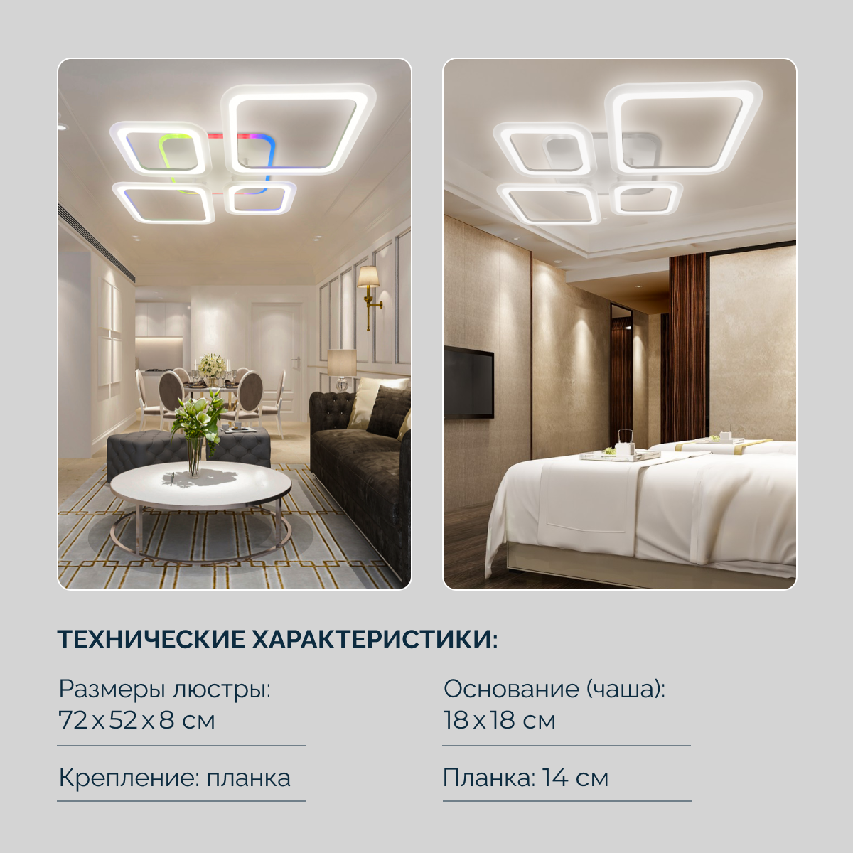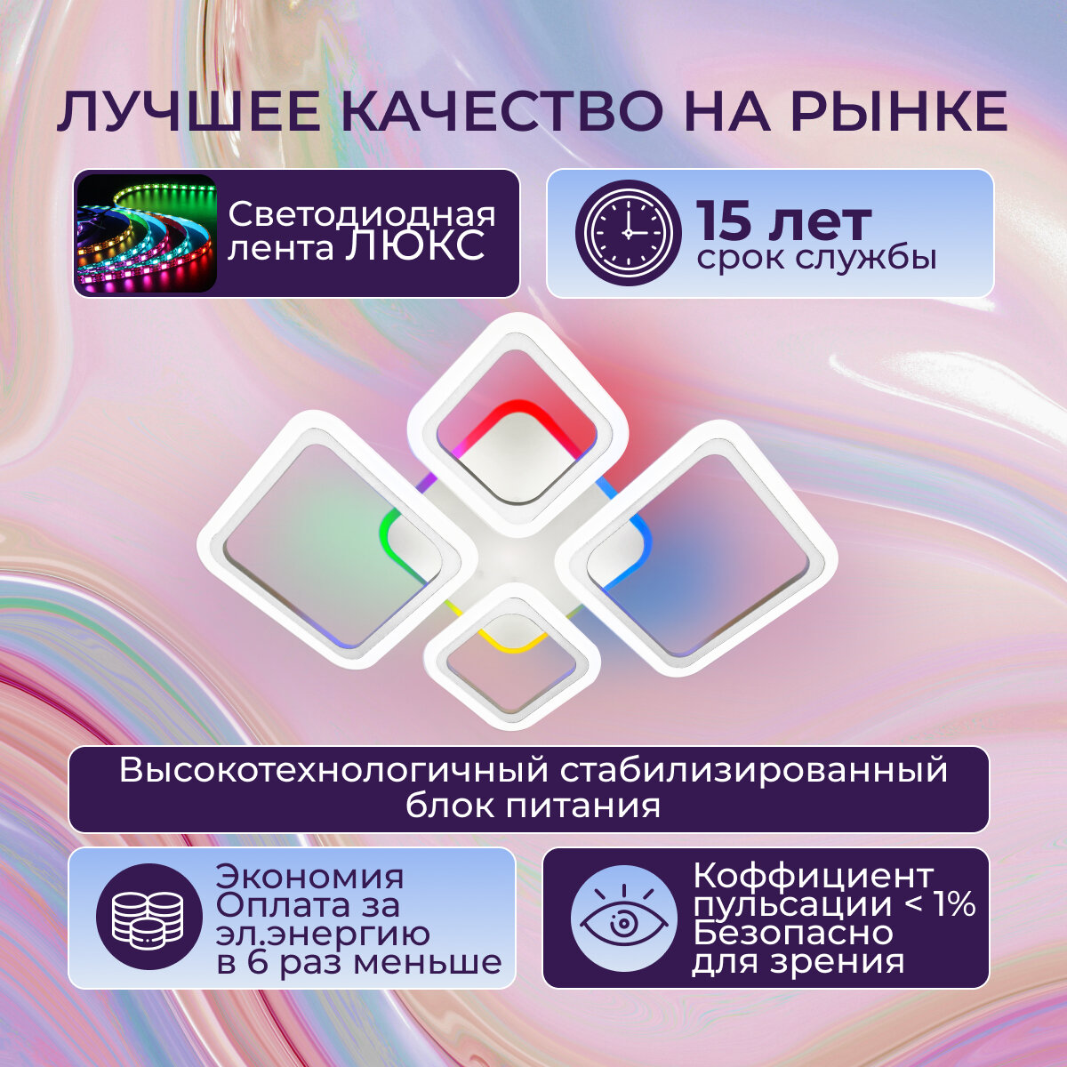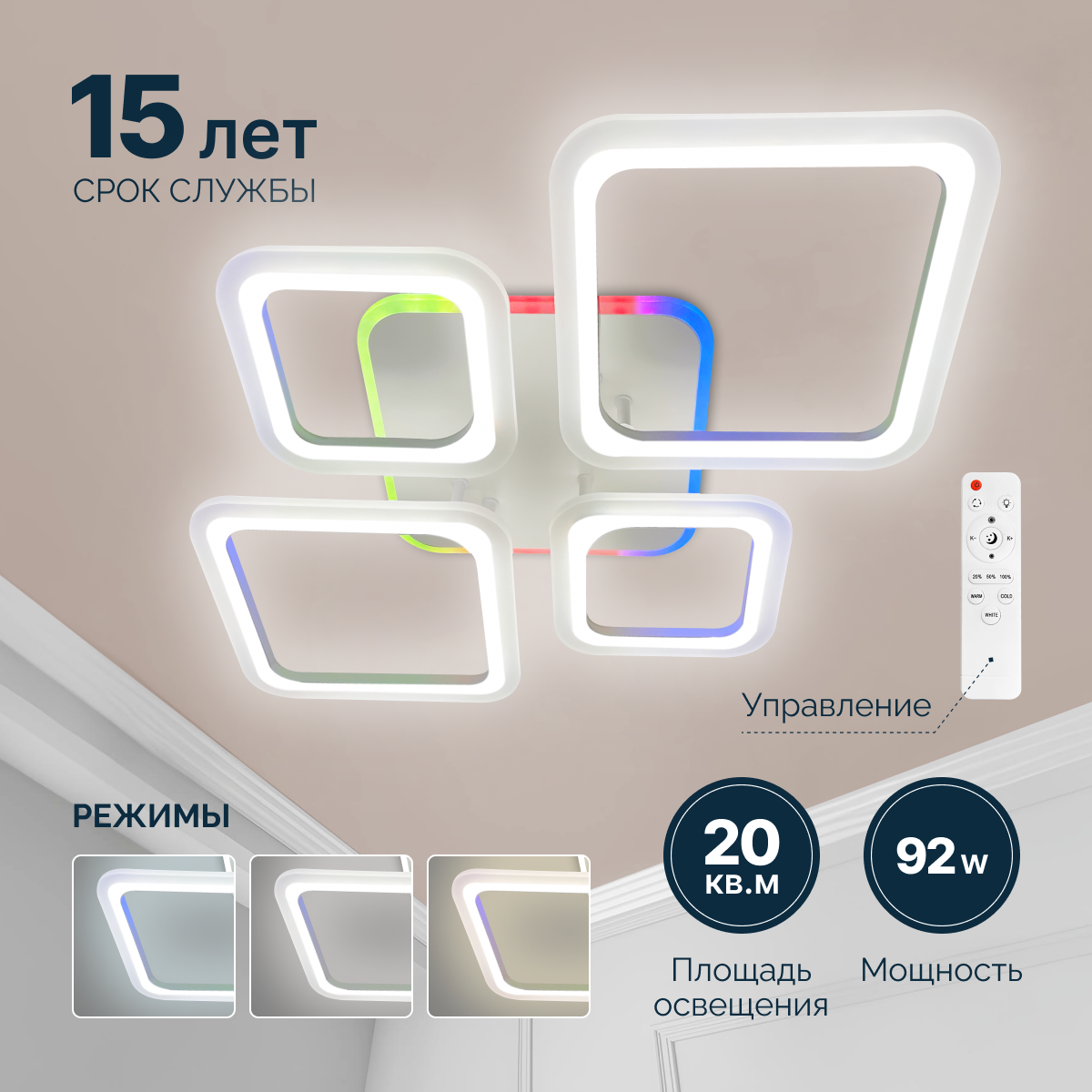 Светодиодная люстра с пультом RGB подсветка, освещает 20м, 97вт, 4 плафона Светкомет интересное: