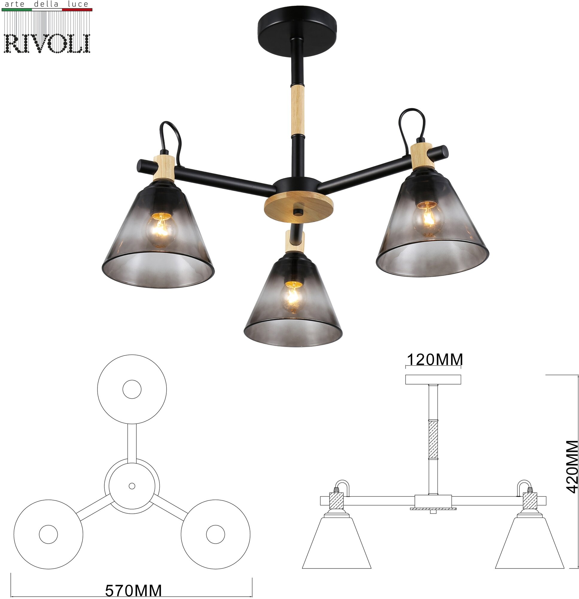 Люстра потолочная Rivoli Elmira под лампы 3хЕ27 40 Вт черный, светлое дерево модерн 9м2